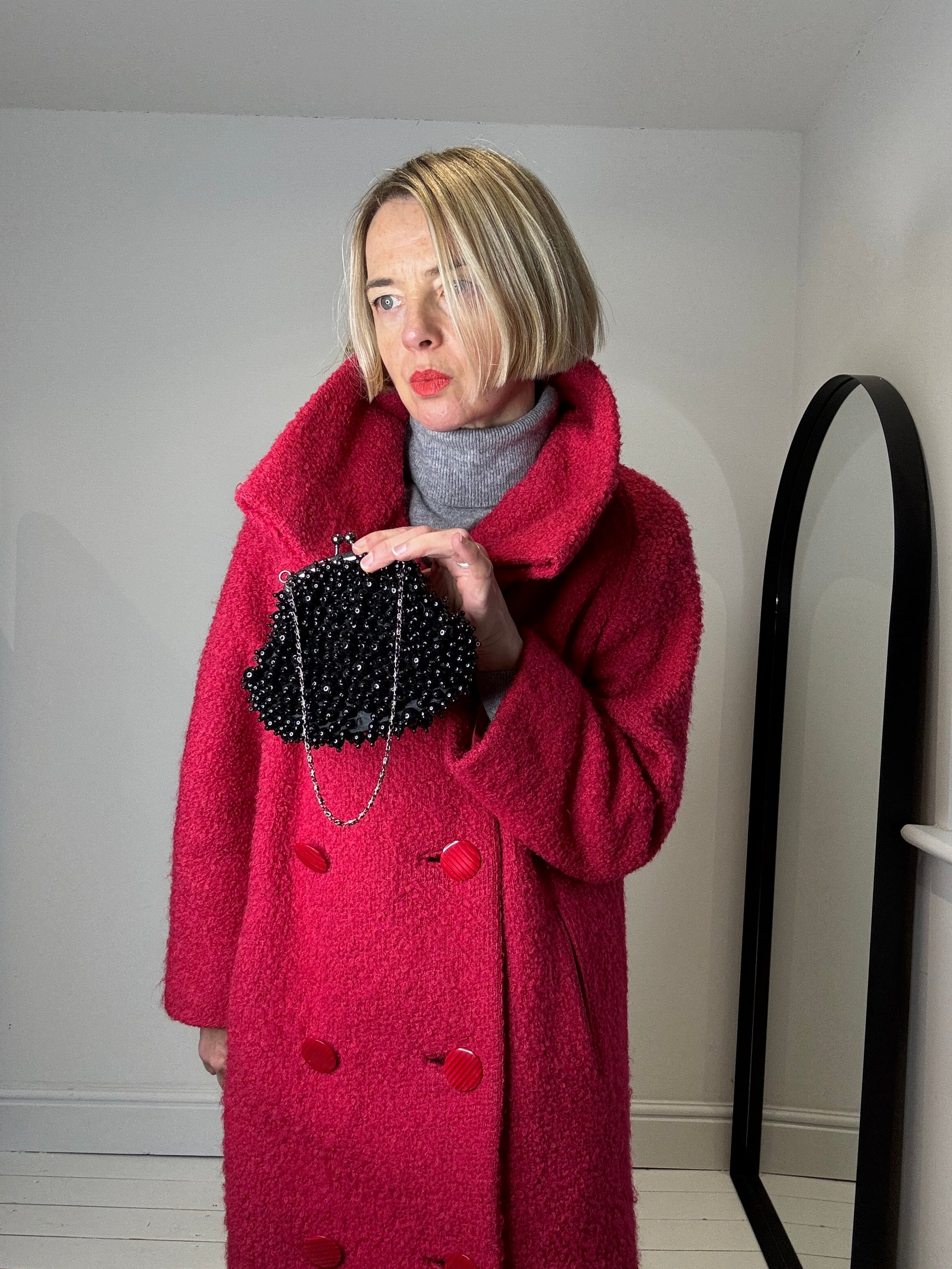 Beaded frame bag with chain handle, assorted black 3D beads, bag is lined, gunmetal hardware by the iconic designer Frank Usher. Please note one bead missing.
