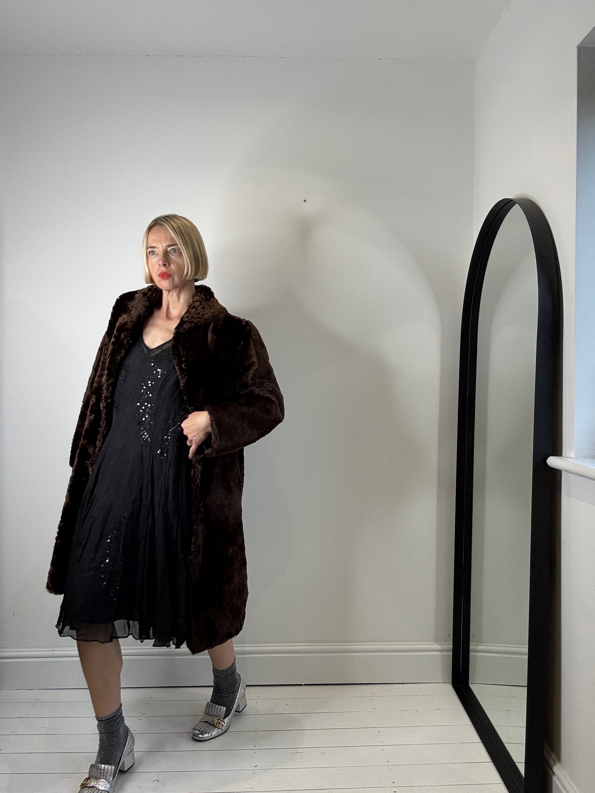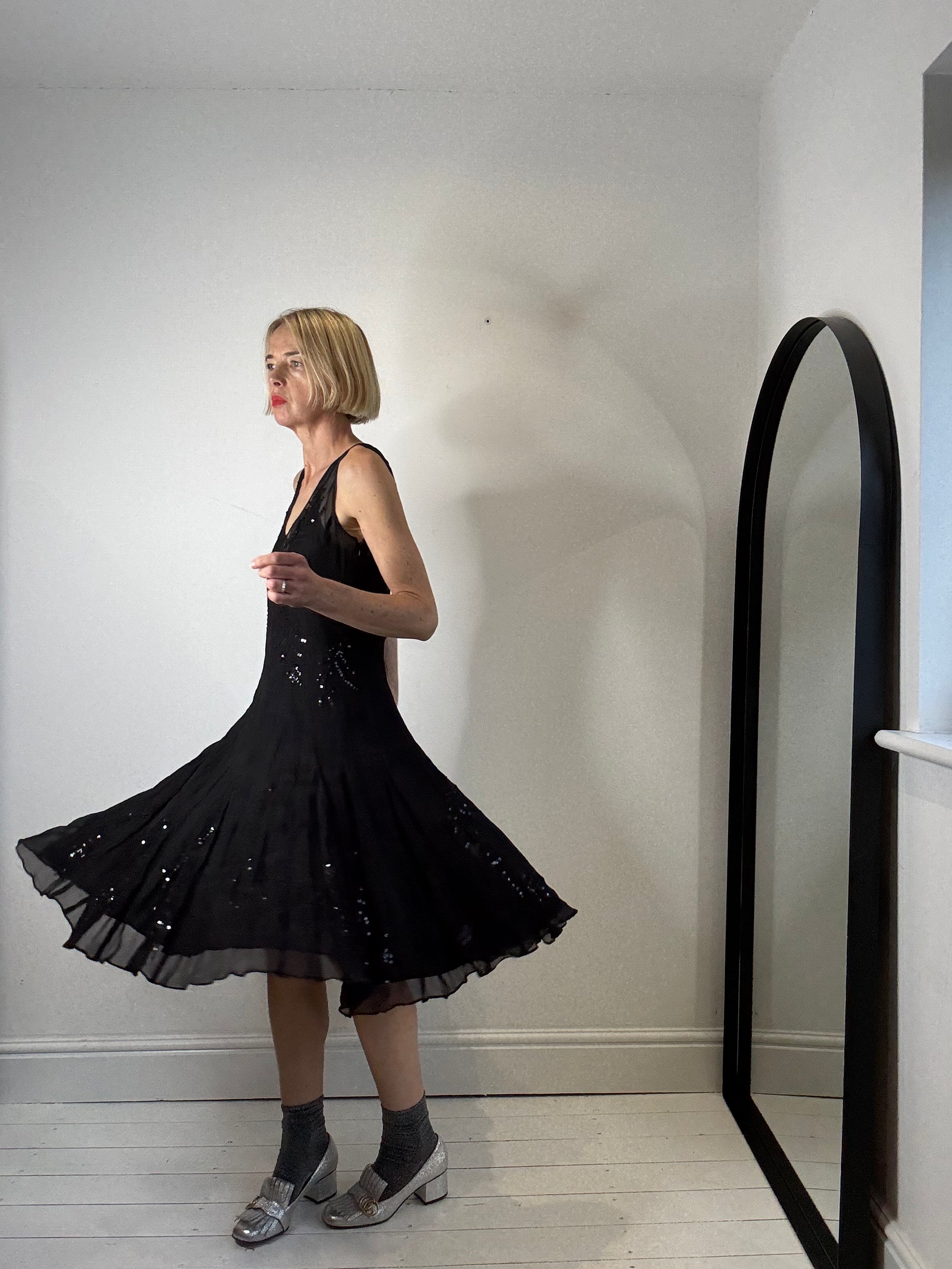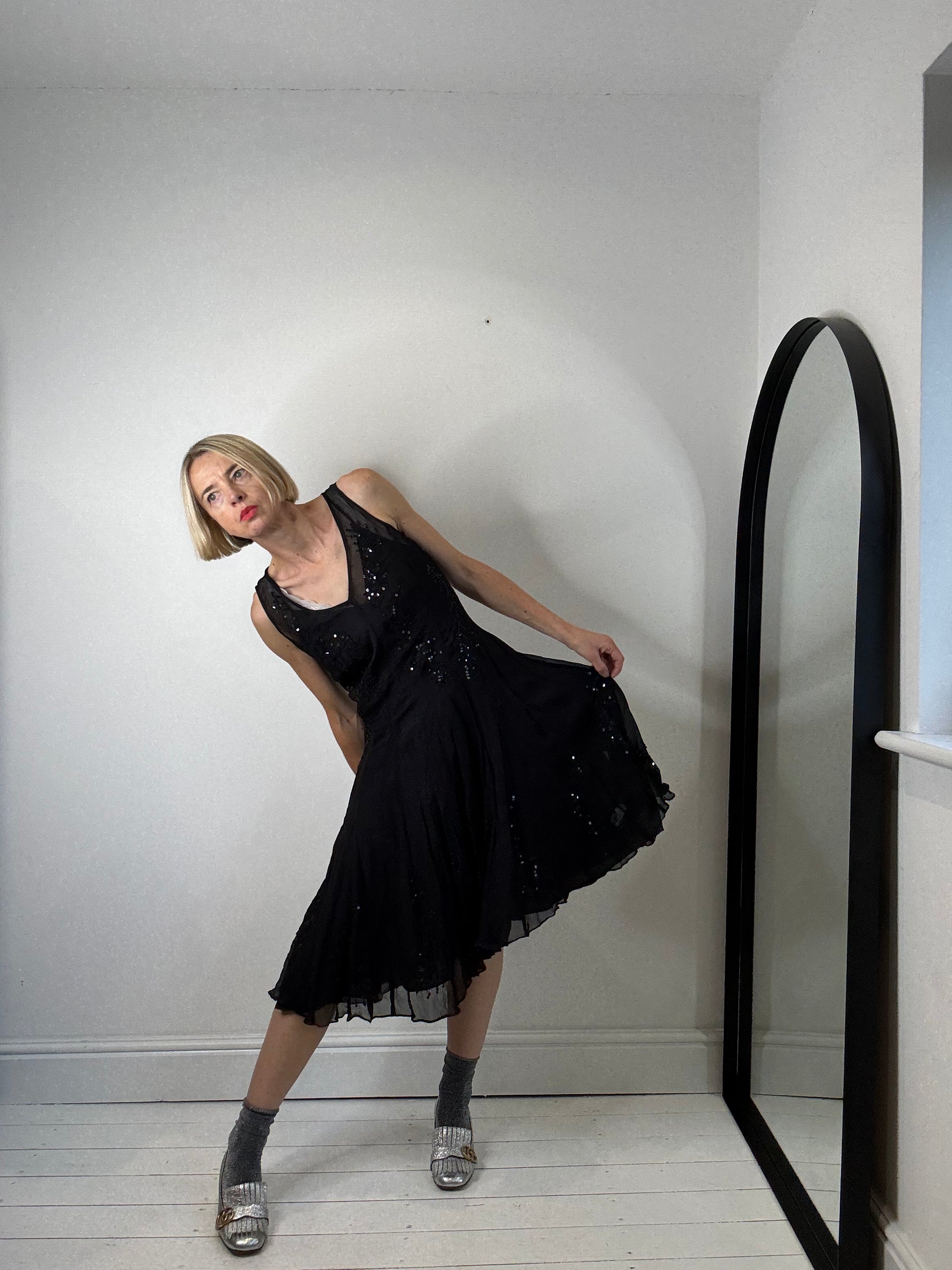 FIT 8-10 Prettiest godet insert sequin embellished dress a sheer silk dress, 1920’s flapper style, v front high back, godet inserts at hem, long side zip, comes with black strappy slip, labelled size 10