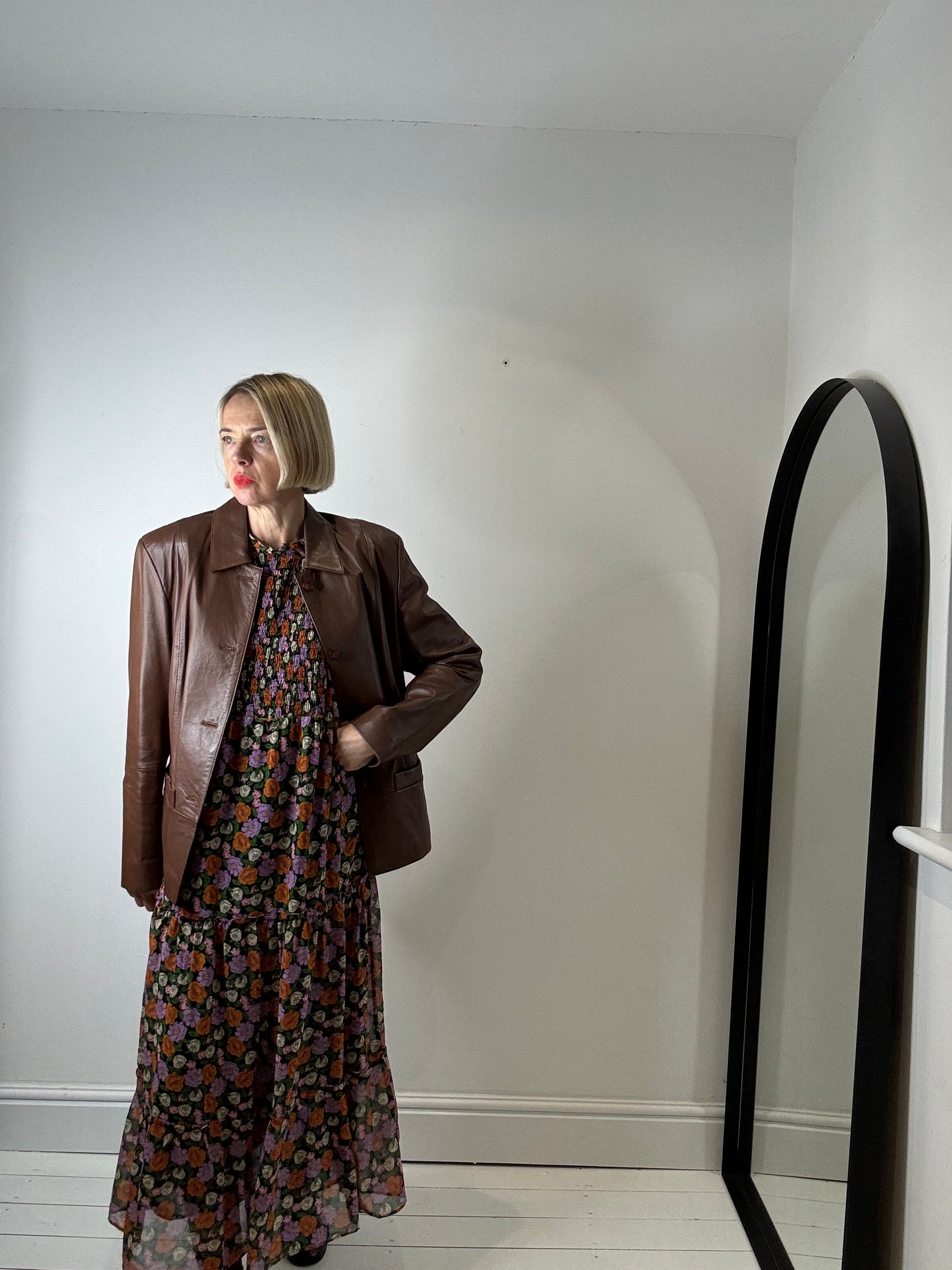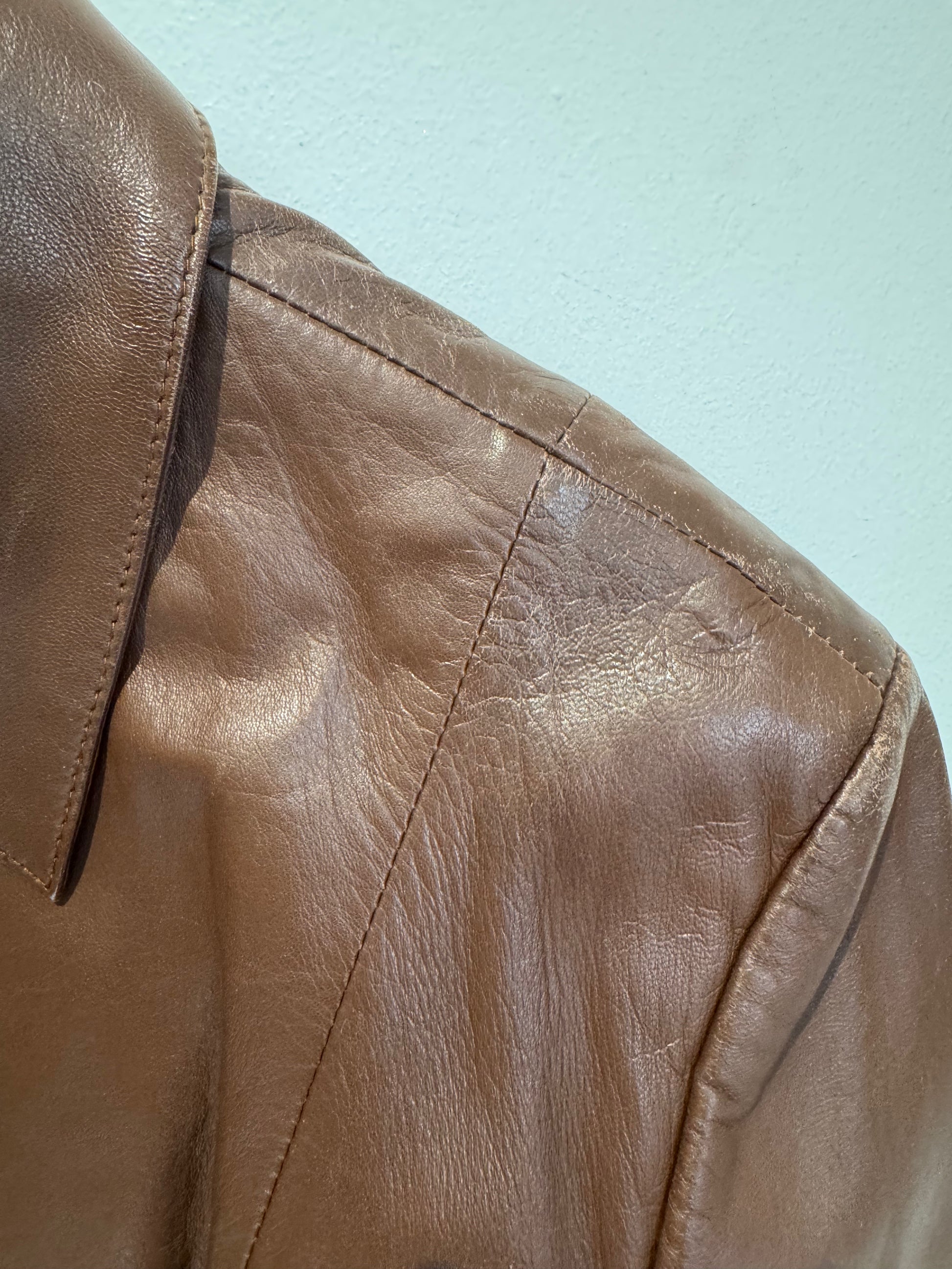 Chocolate brown 100% leather jacket, single breasted, welt pockets, fully lined, 4 hole ring edge horn buttons, soft leather with structure, easy to wear, overall condition is very good, with some scuff marks on shoulder, see images for detail, labelled size 16, armpit circ 110cm, cross front at bust point 45cm, please ask for additional measurements if unsure. depending on desired look FIT 12 to 14