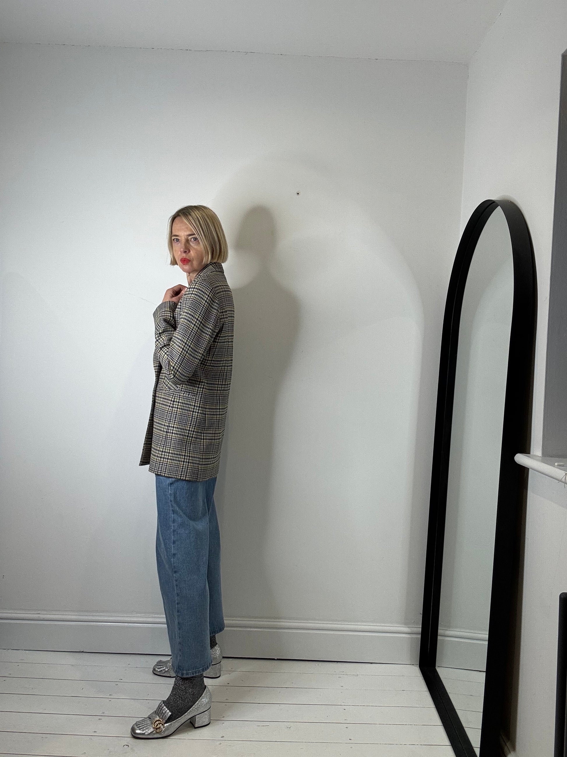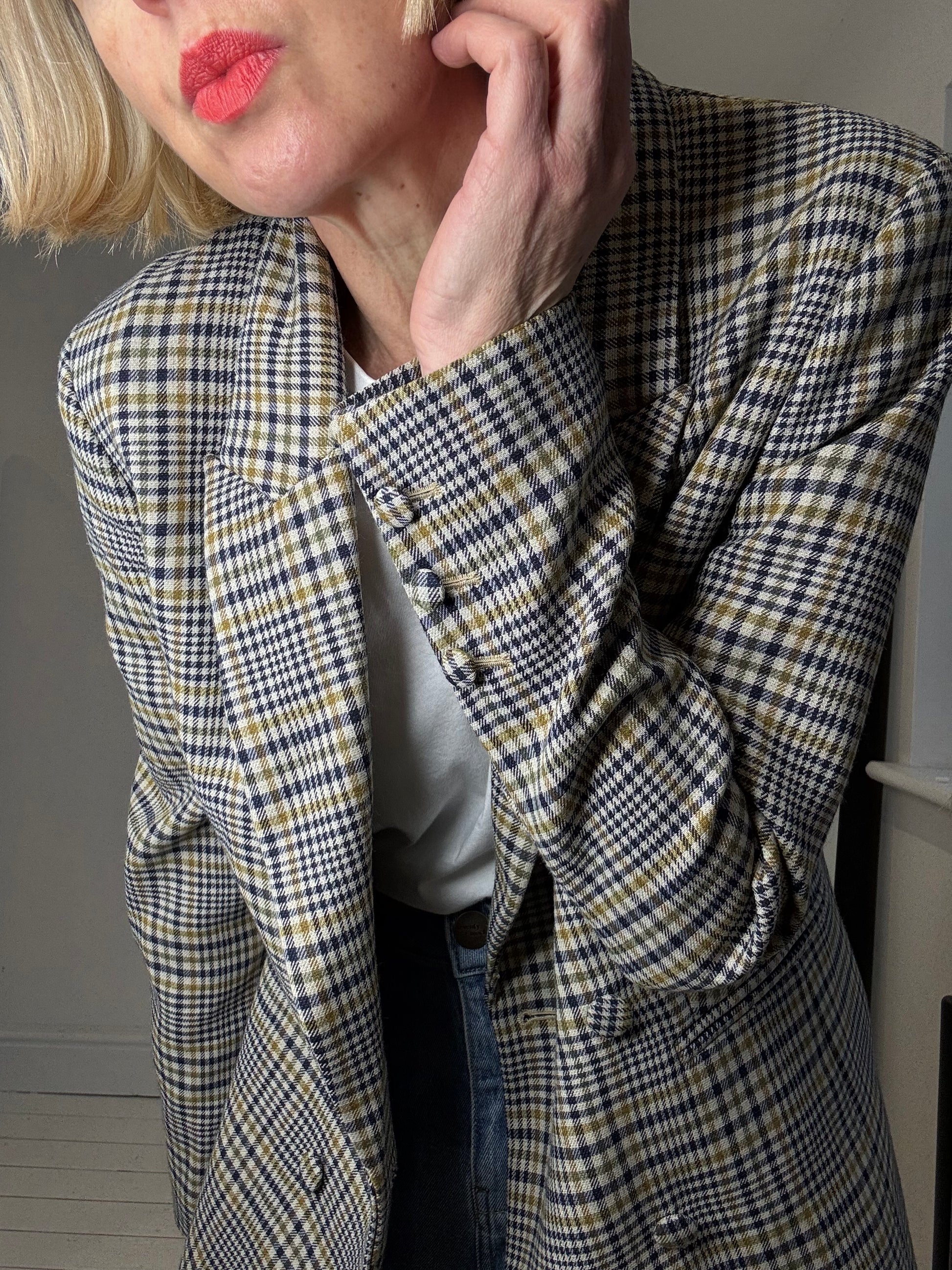 Double breasted blazer in a compact dry handle tailored cloth, the check is ade up of a neutral, navy, dark mustard and olive, clean lines, jet pockets, covered buttons, fully lined with internal pocket, a really good quality well made blazer, RRP £129, labelled size 36 / 8
