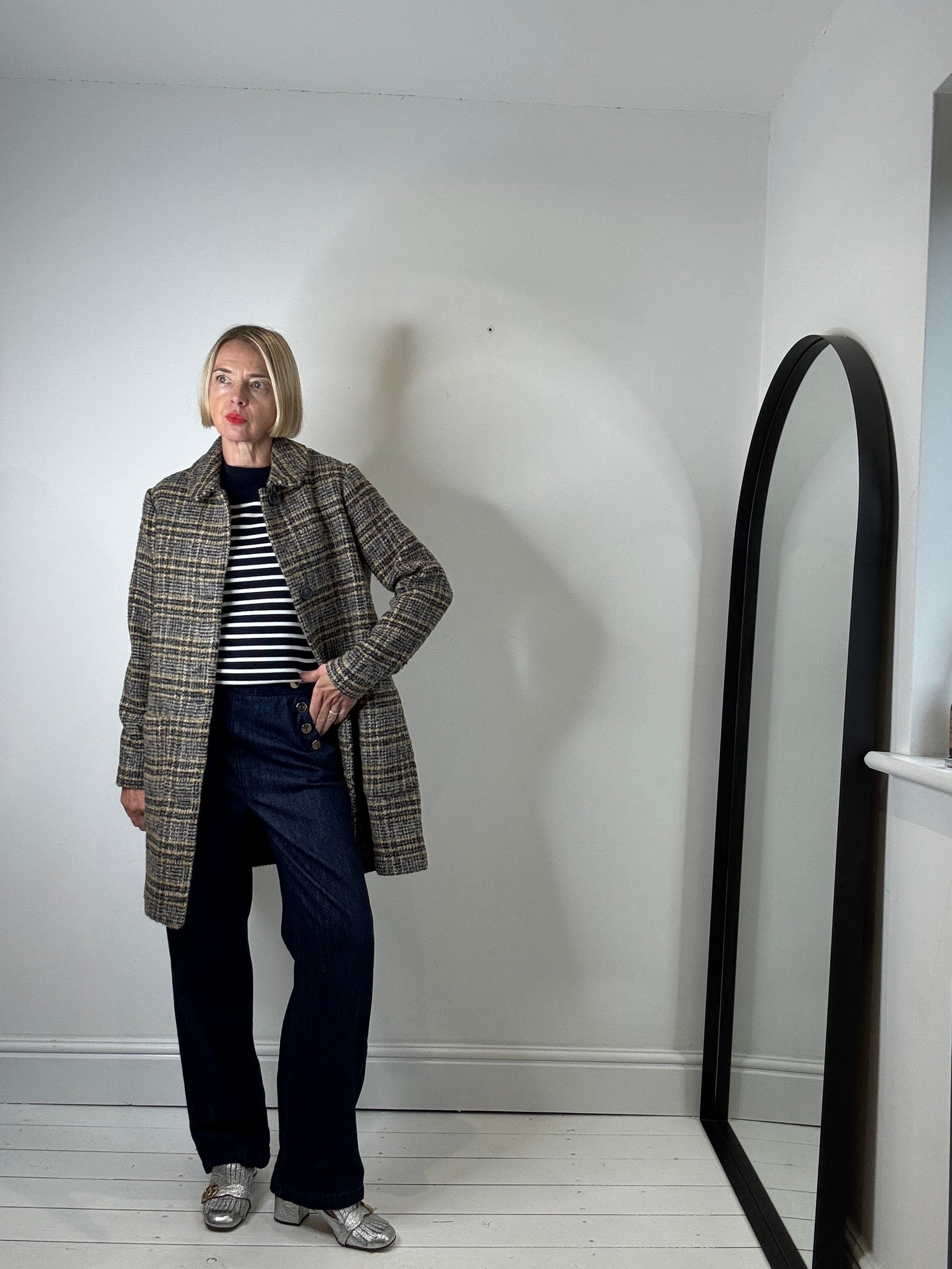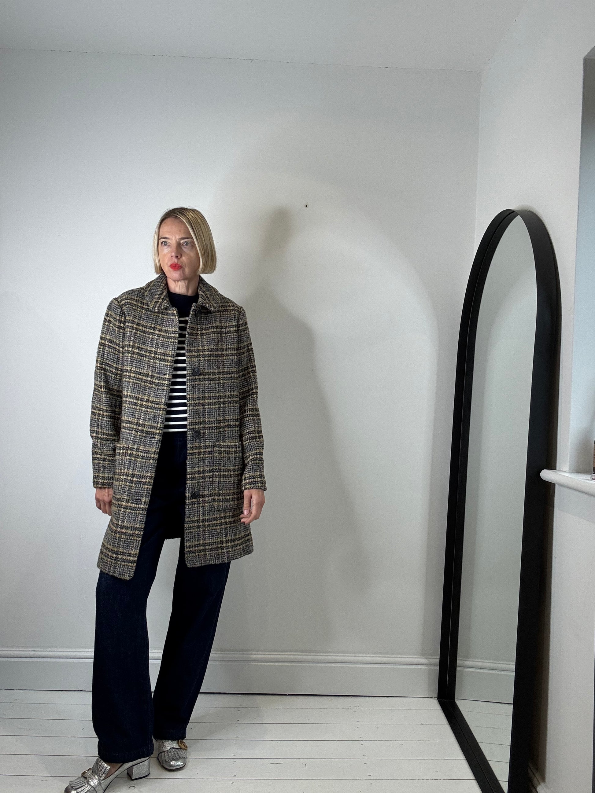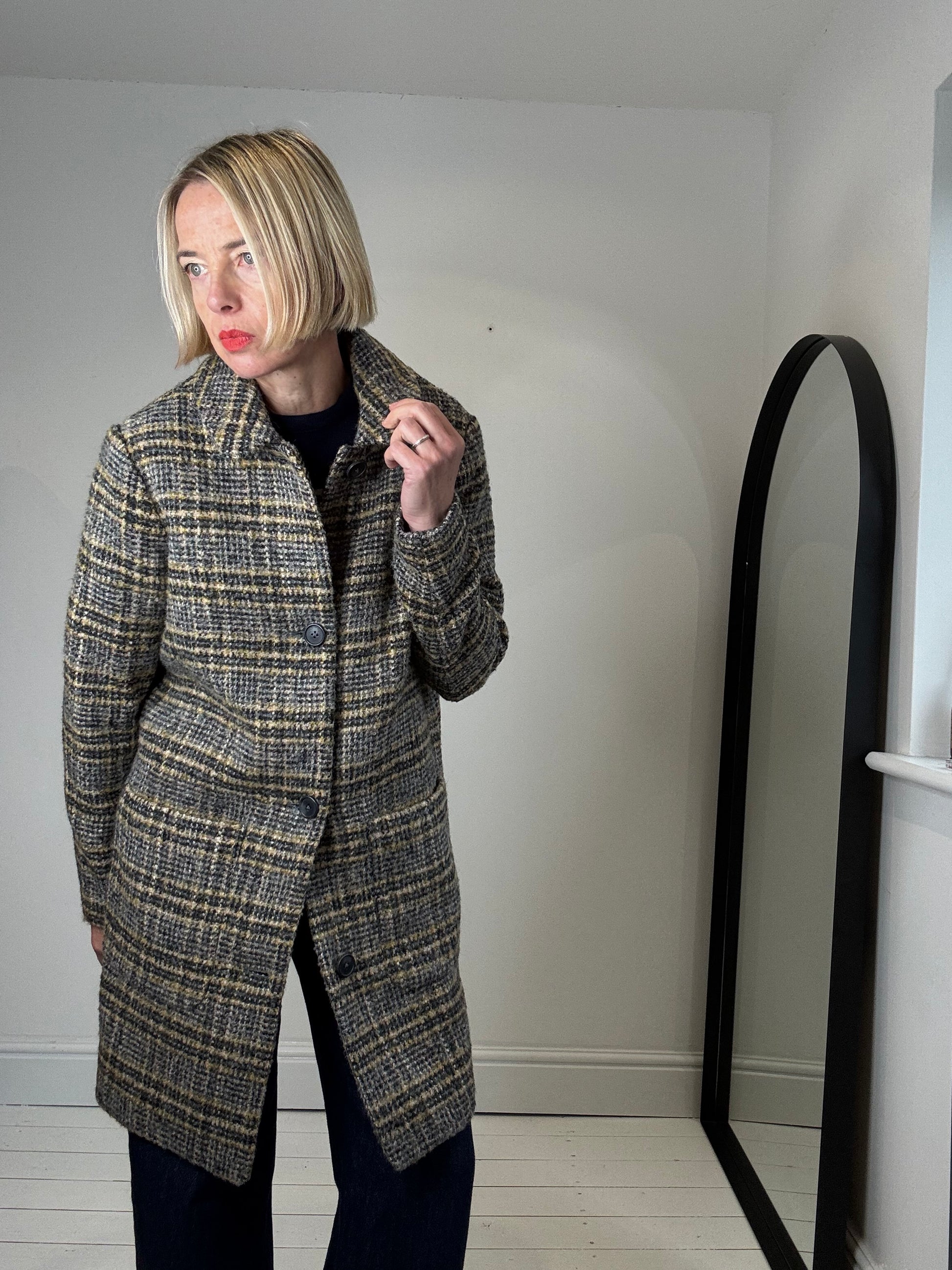 FIT 6-8 Patch pocket soft textured check sb coat, button through, fully lined, armpit circ 101cm, labelled size 8
