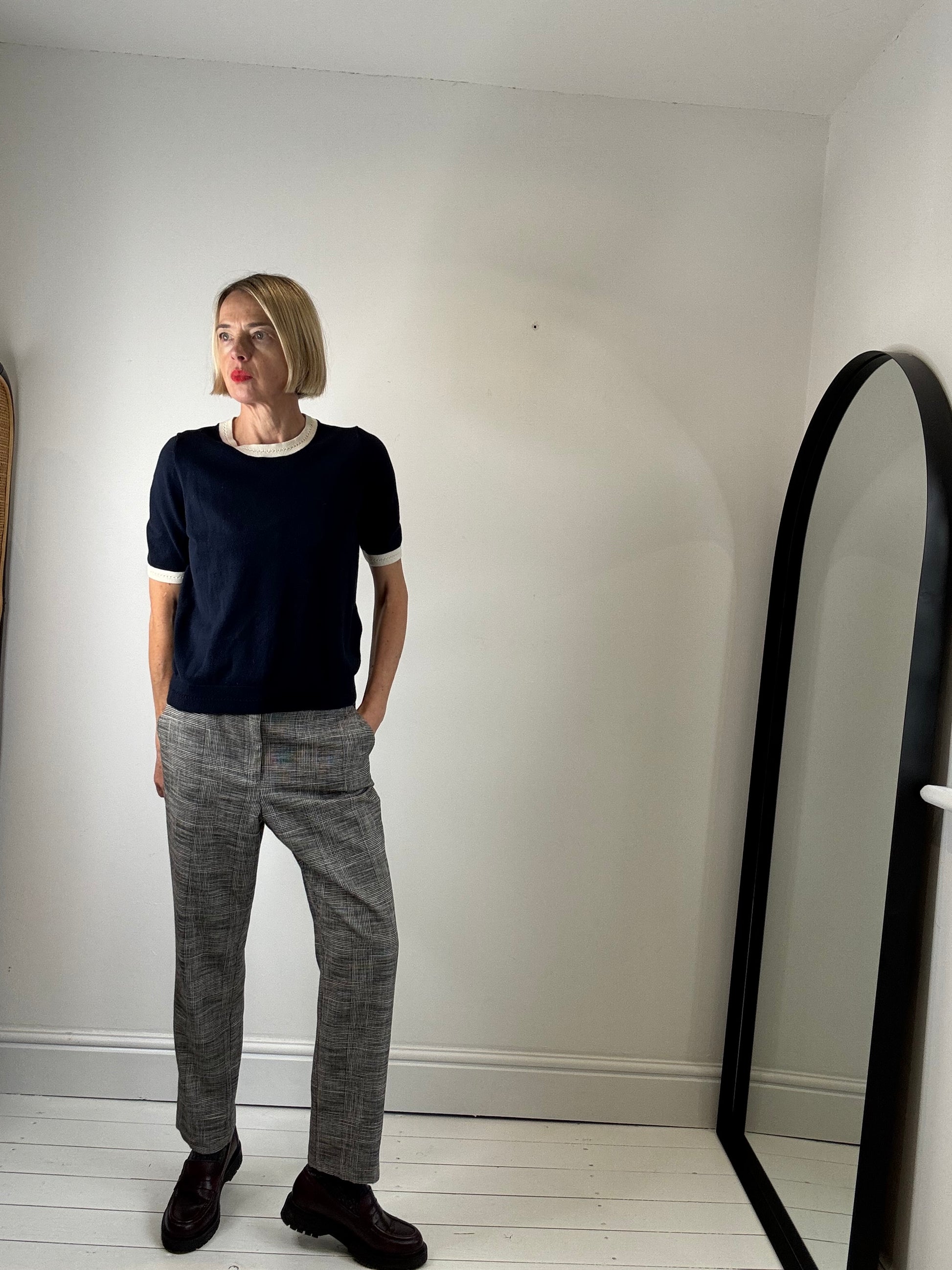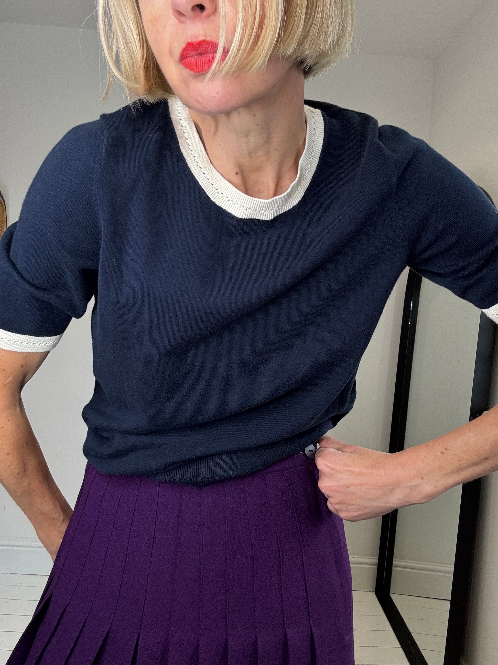 FIT 8-10 Knitted tee, navy base with cream contrast collar and cuffs with pointelle detailing, 80% cotton labelled size small, depending on desired look, FIT 8 to 10