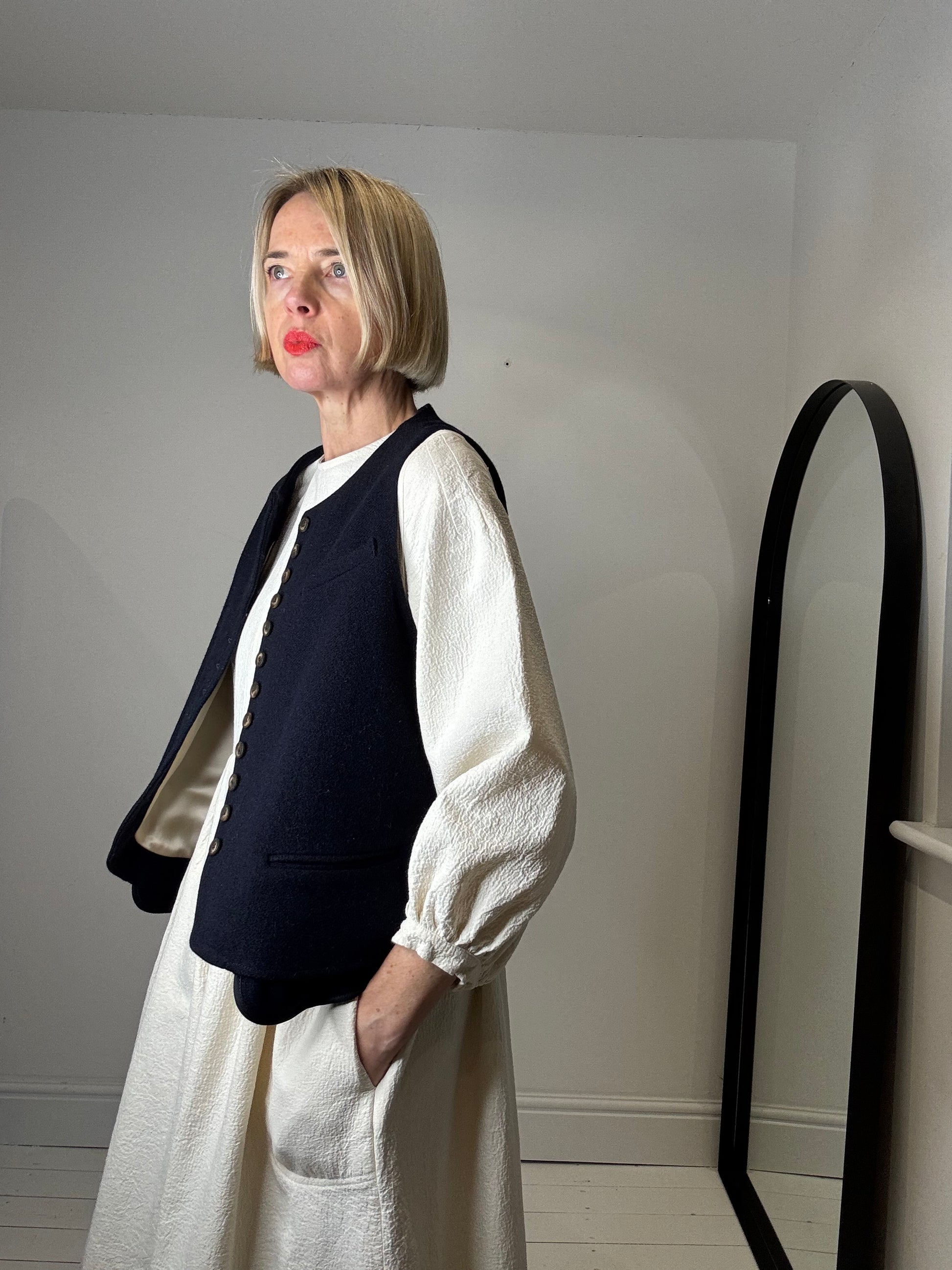 Beautiful organic cotton midi dress in a rich cream colour. Immaculate condition. Structured textured cotton, deep pockets, full skirt, buttoned at the back, voluminous gathered sleeves. Labelled size 8. RRP £485