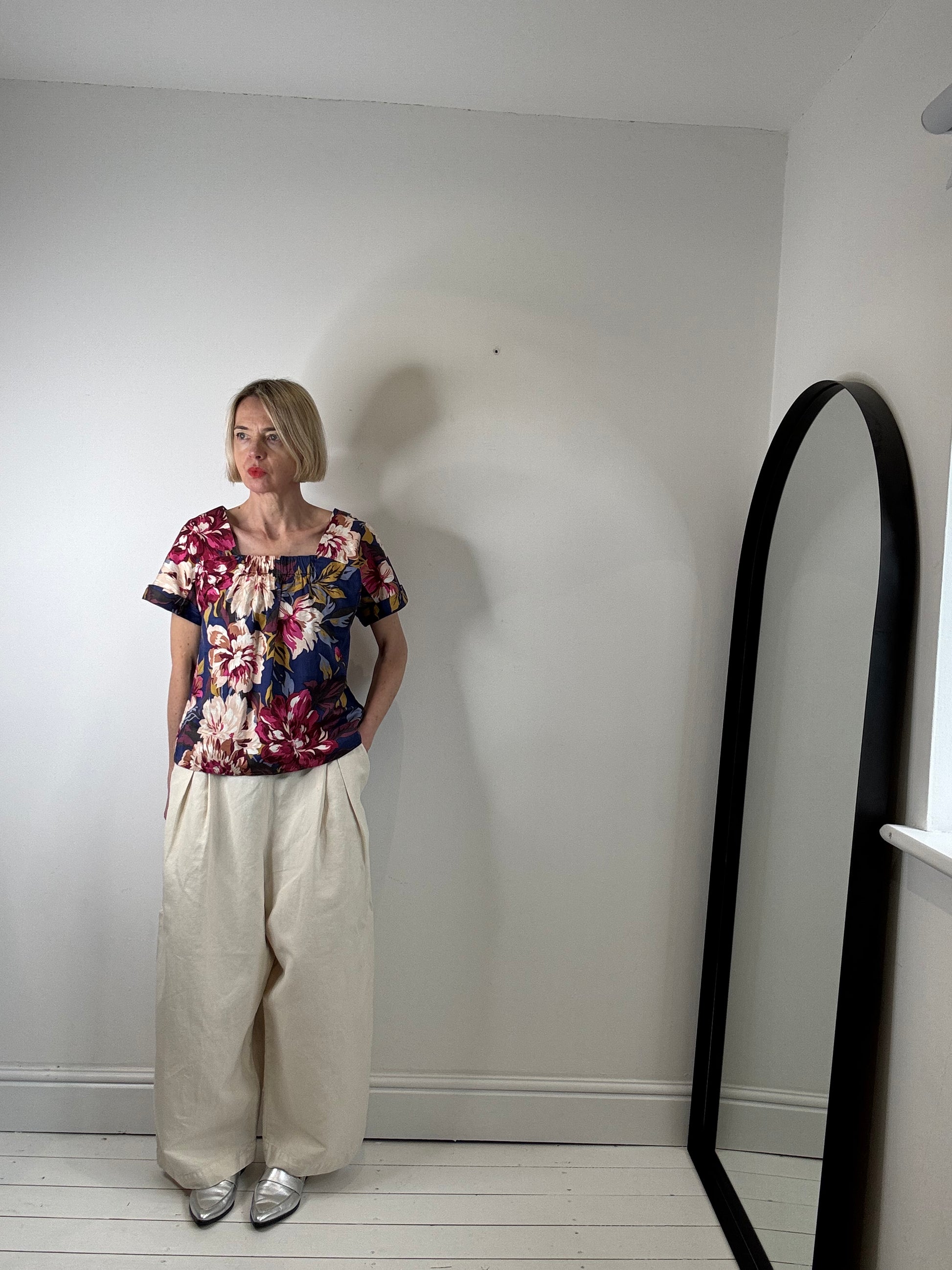 Cotton large scale floral top, square neck with button at the back and elasticated panel at the centre front, slightly a'line shape, labelled size 12, depending on desired look, FIT 10 to 12