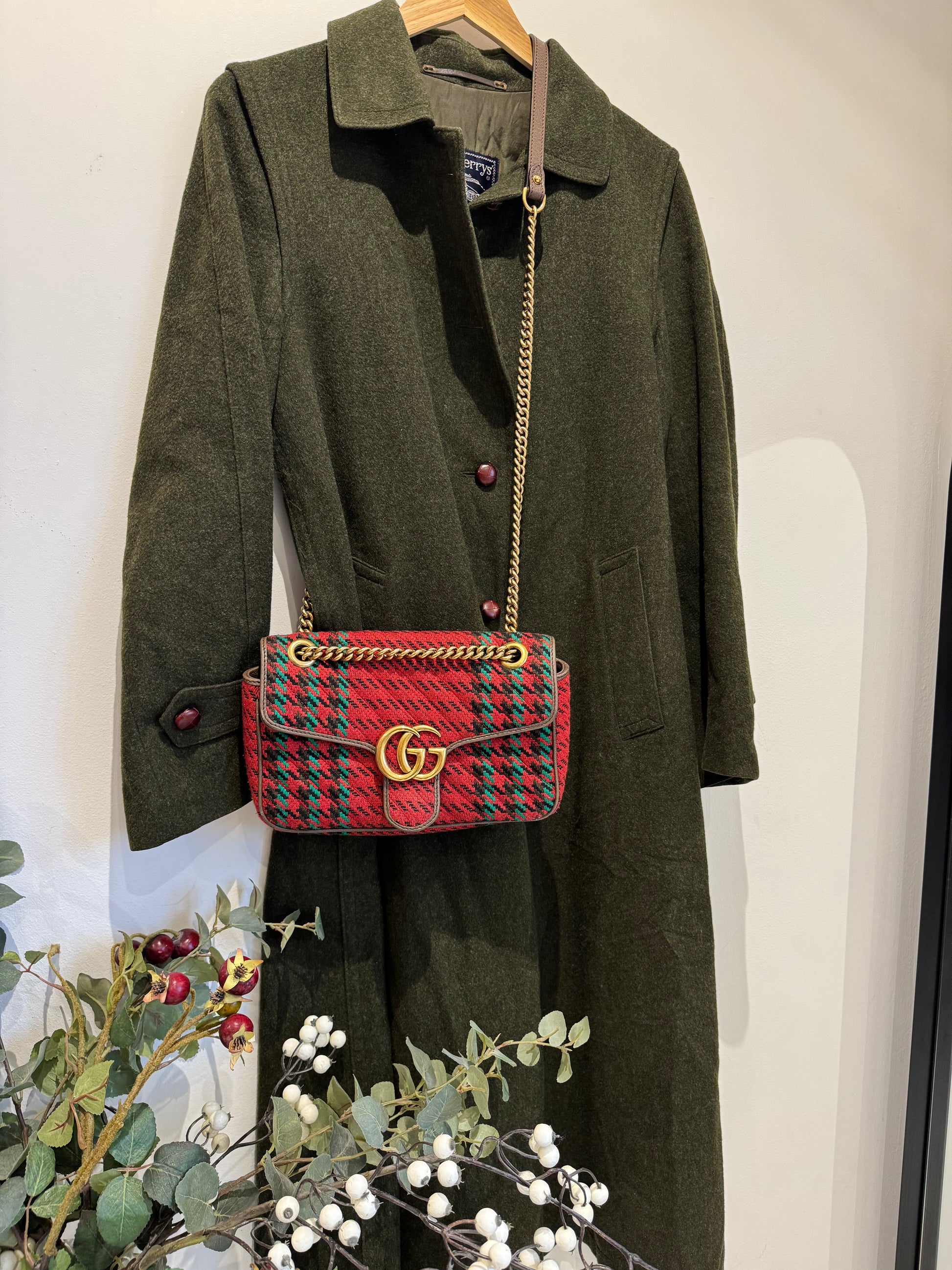 Iconic GG Marmont flap bag in a green and red wool tartan. Adjustable cross body or shoulder strap, part chain, part leather. Brass hardware, fully lined. Internal zip pocket. QR code and serial code (see last photos). Very good condition. Minor signs of wear. Length 26cm, height 14cm, depth 8cm.