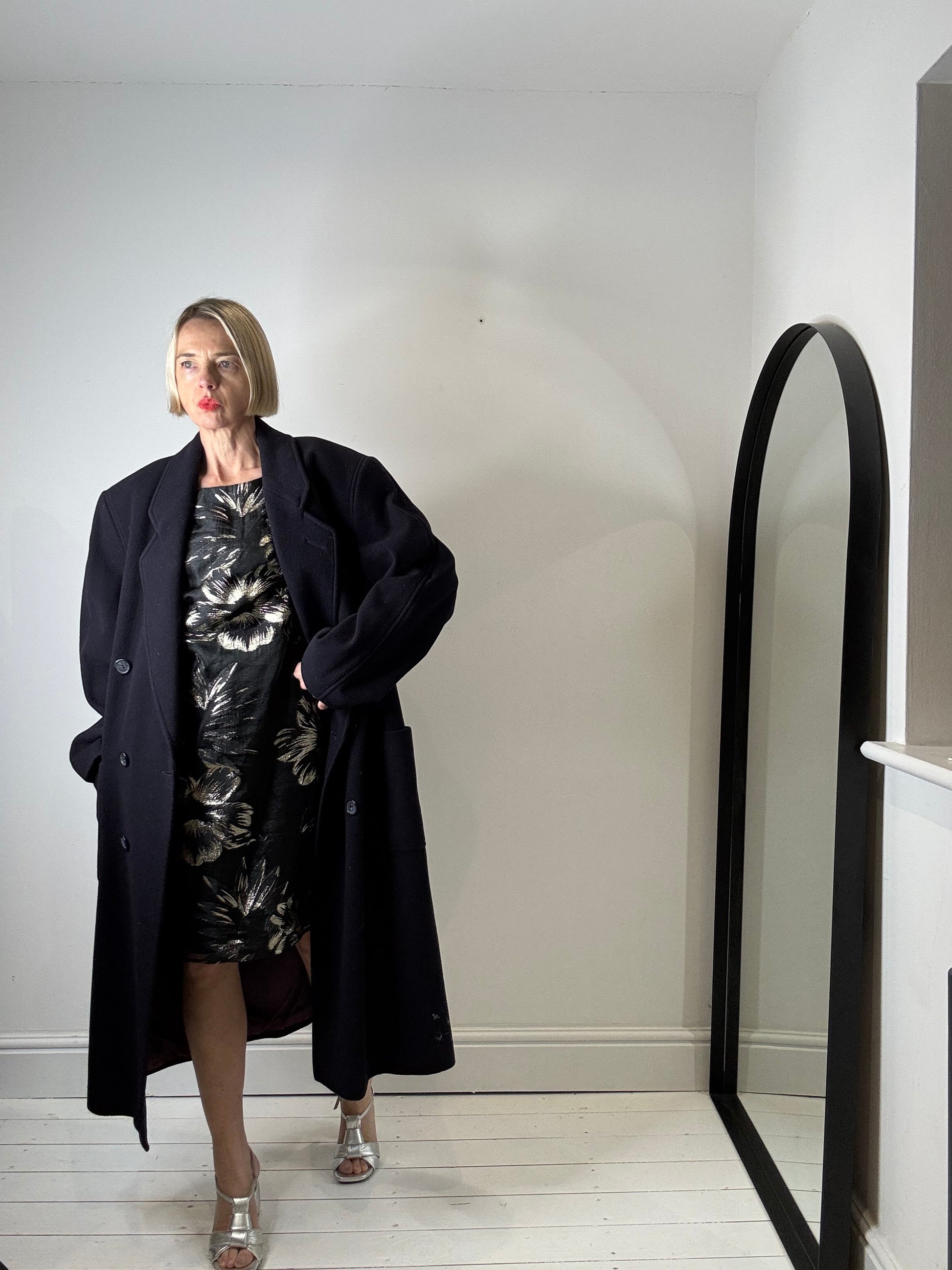 Jacquard dress with v back, pencil shape, zip fastening, knee length (model 5ft 6.5"), burn out jacquard, layered with solid black and fully lined, labelled size 12, best fit 12