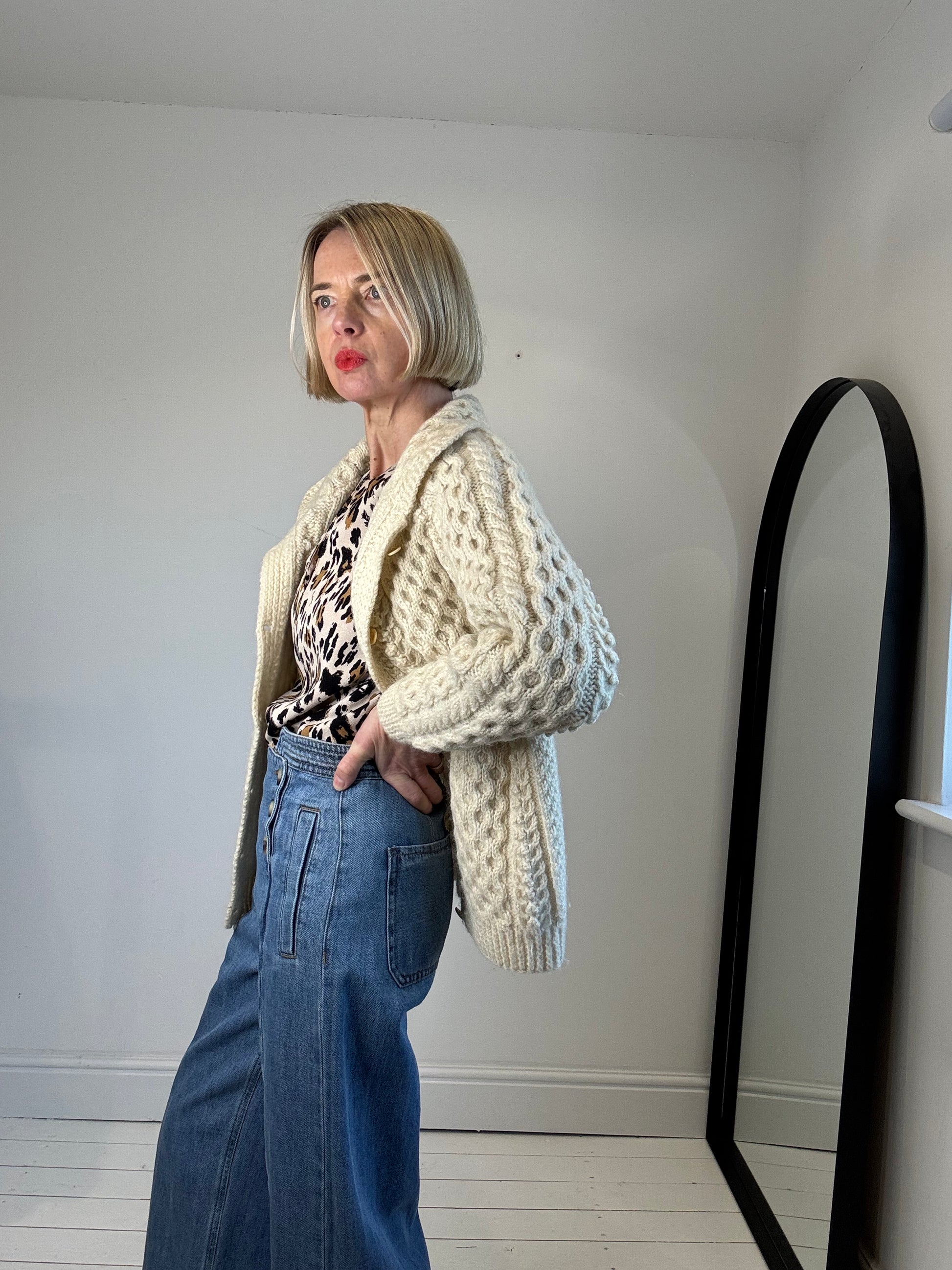 Animal print key hole blouse, long sleeve, viscose crepe, sleeves gather into deep fixed cuffs, the perfect 9am to 9pm top, labelled size 36 (brand size 10), depending on desired look, FIT 8 to 12
