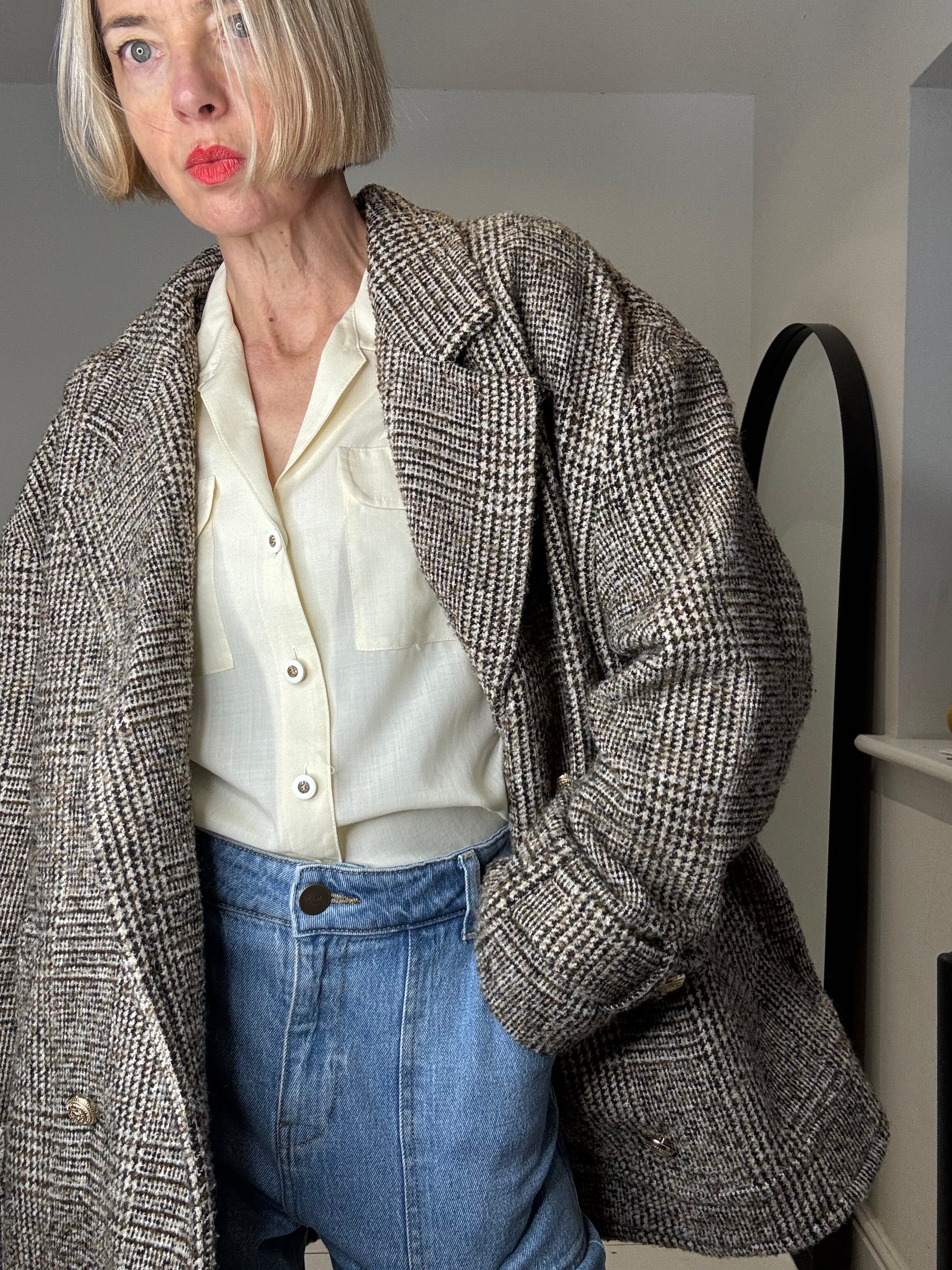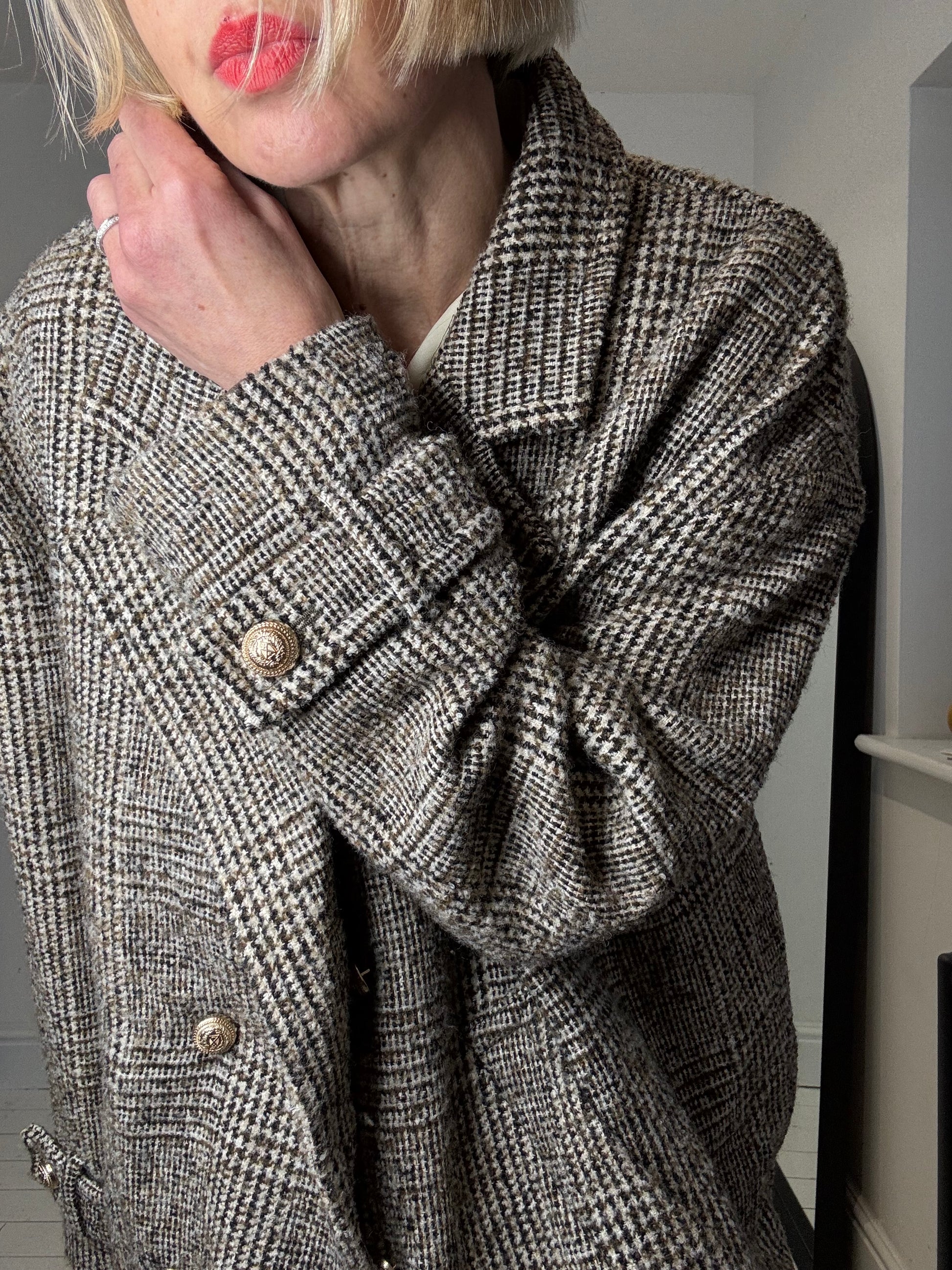 Check peacoat style jacket, db fastening with antique brass embossed shank buttons, cuff tabs, open collar and revere which can be worn closed, back storm flap, angled welt pockets, fixed hem with pleats either side of back panel for fullness, internal pocket, fully lined, brown based check. Labelled size large, depending on desired fit could work for 10 to 16, RRP £175