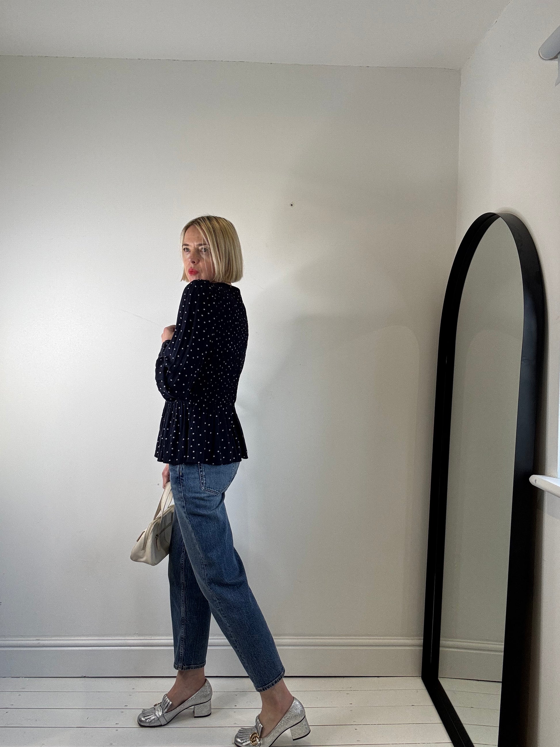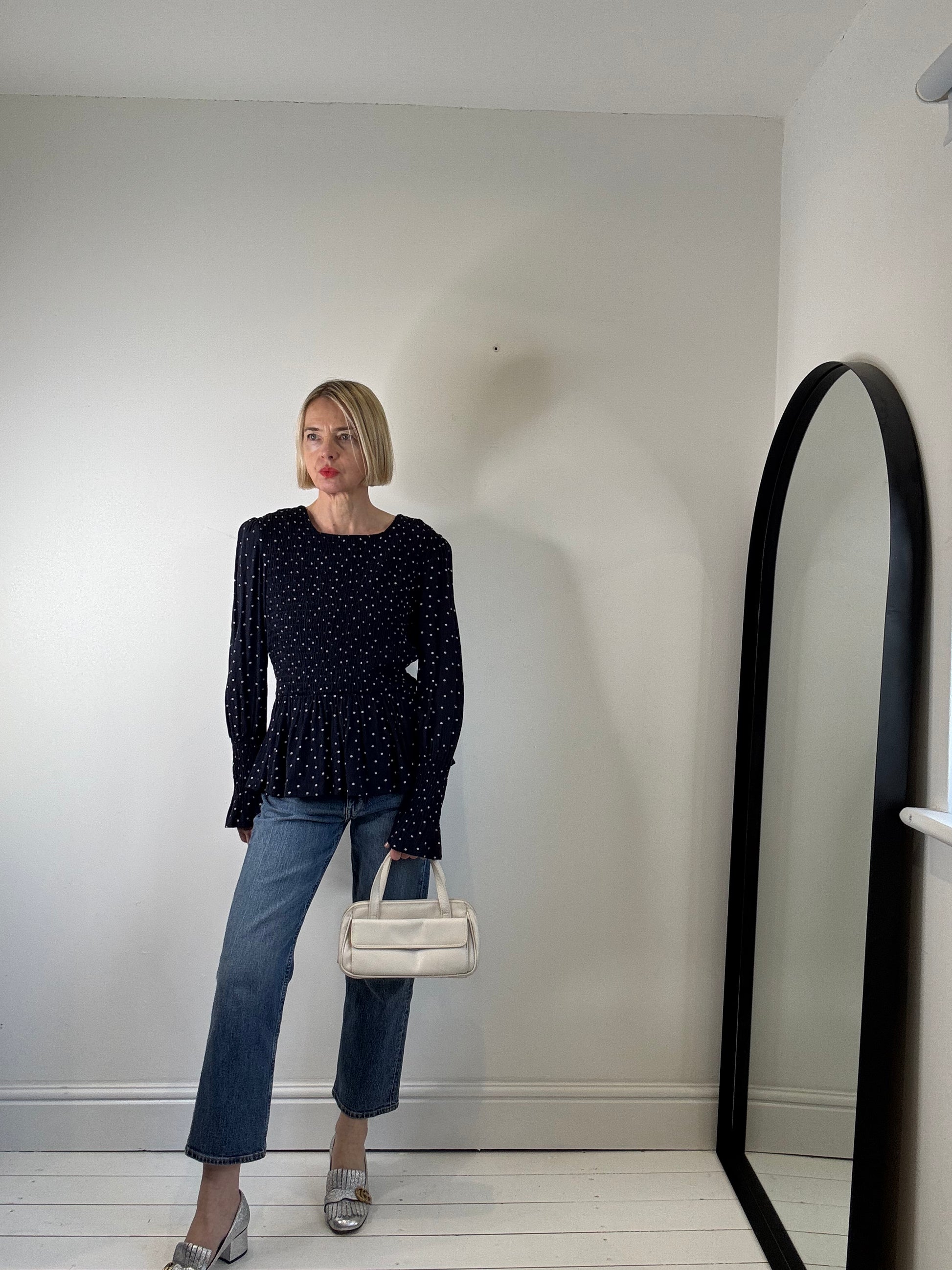 Navy smocked body peplum hem and cuffs, long sleeves, soft easy to wear, fluted cuffs and hem, button and key hole at the back, white micro spot print, labelled size 10, depending on desired look, FIT 10 to 12