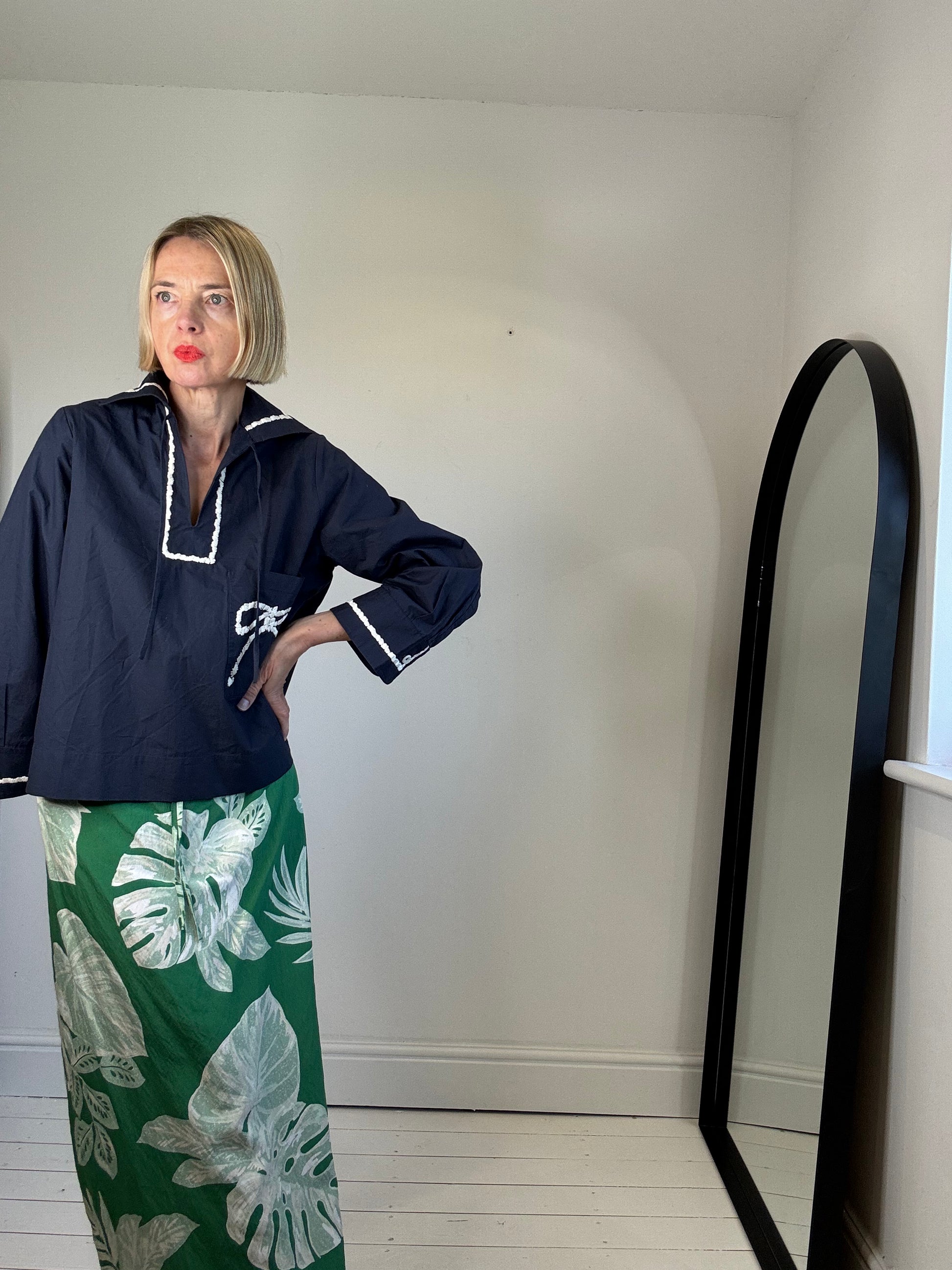 FIT 8-12, TOAST navy cotton open collar top with nautical top stitch detail and rope design on the pocket, tie at neck or wear open, square boxy fit, bracelet length sleeves, new with tags, labelled medium, RRP £145