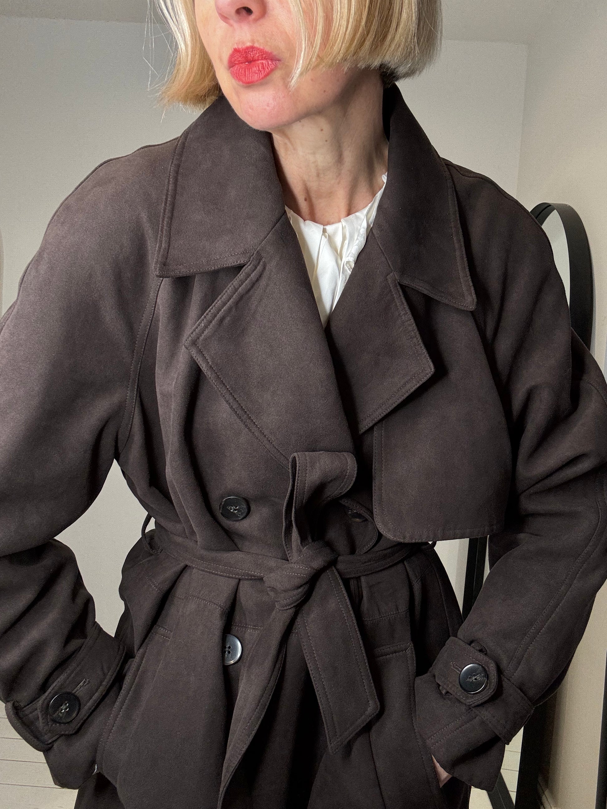Chocolate brown belted trench coat, fully lined, double breasted, reluctant to call this faux suede because it's a lot nicer than that, it's a sort of moleskin, faux suede hybrid (no labels but does not feel like polyester, feels like a very soft nappa suede), not has heavy or stiff as cord, but not fly away, mid weight feels substantial but soft with good drape, raglan sleeves, twin needled all the way round, well made, self coloured 4 hole buttons, cuff straps with buttons, self belt, back storm flap, front gun flap, armpit circ 121cm, cb length 123cm, depending on desired look FIT 10 to 16