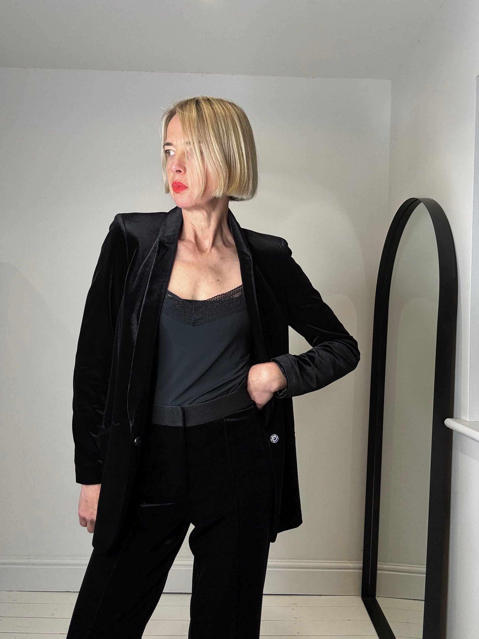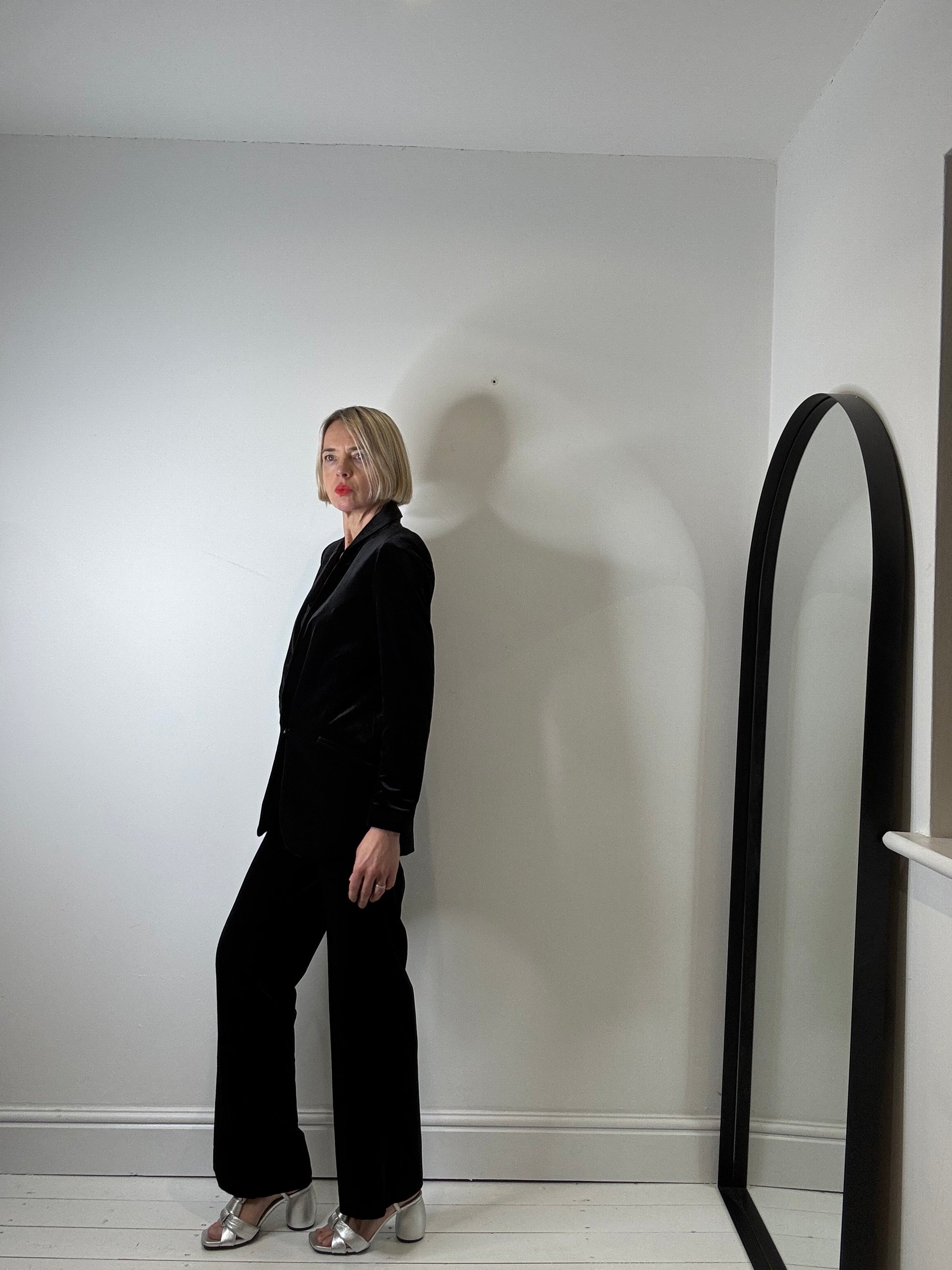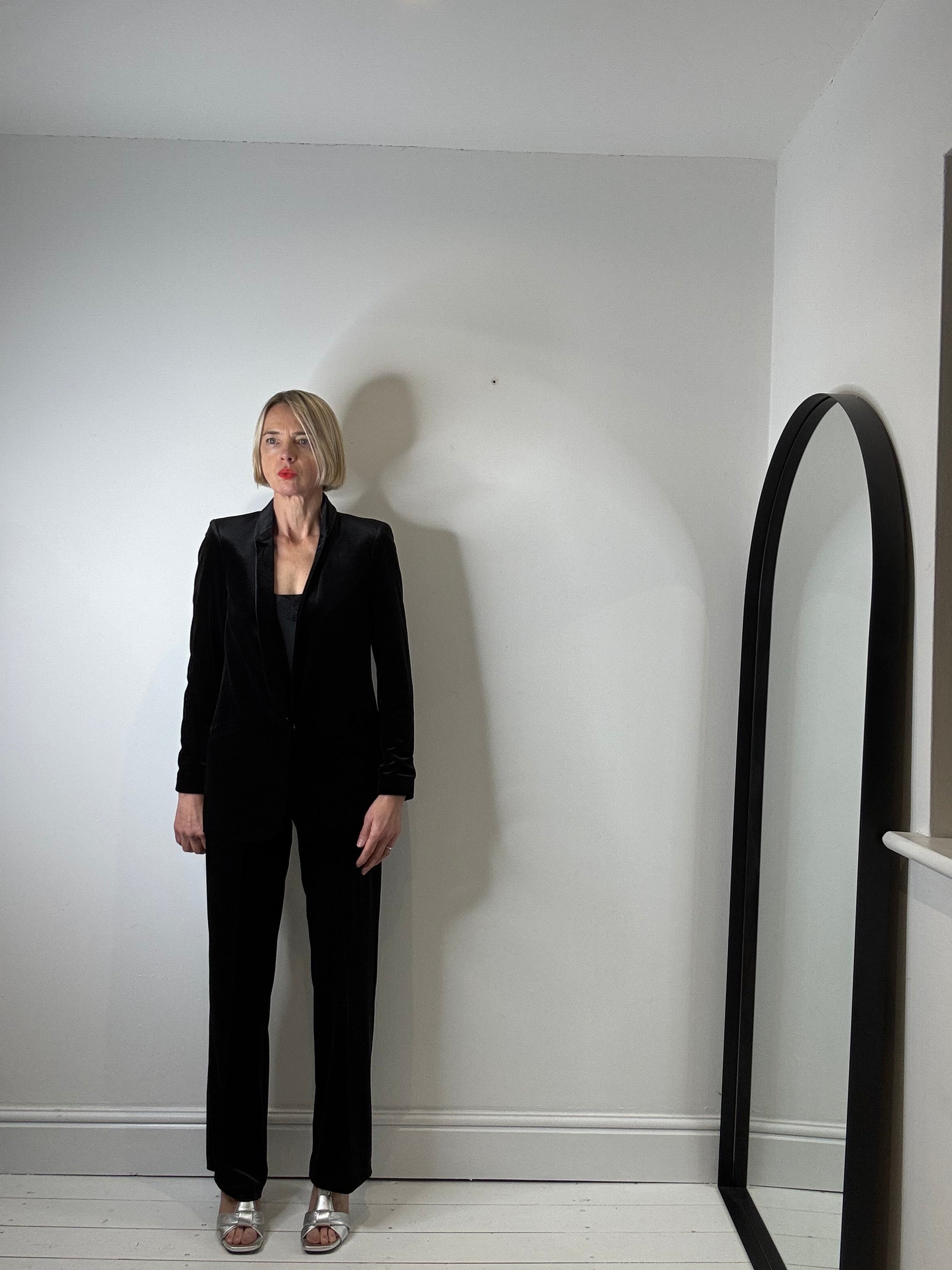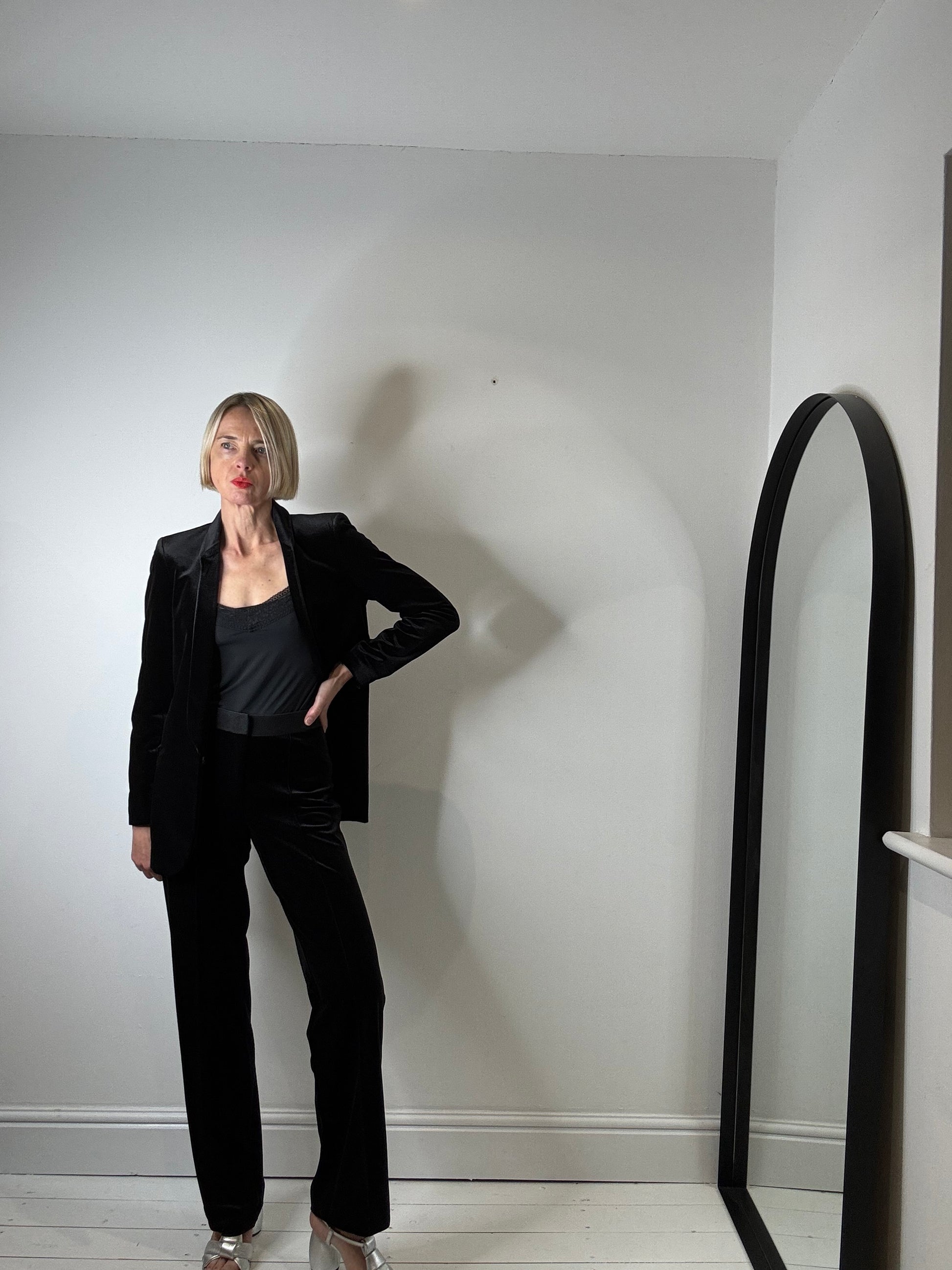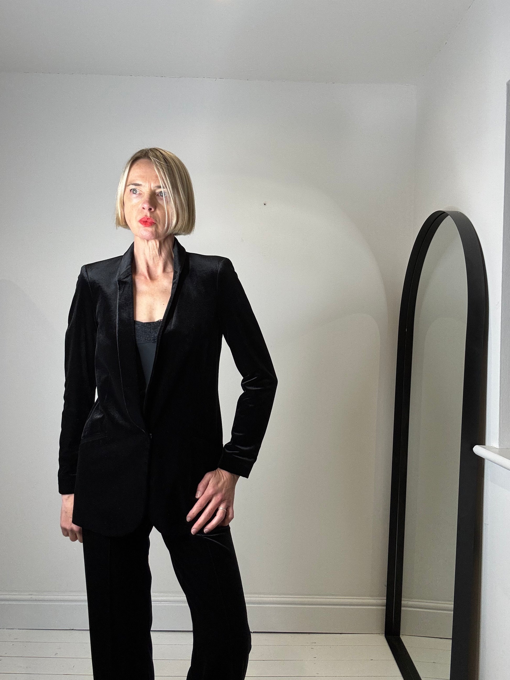 Velvet suit, shawl collar blazer with slim straight leg trouser. Single breasted jacket with popper fastening, fully lined, trousers have contrast textured waistband, both pieces labelled size 8