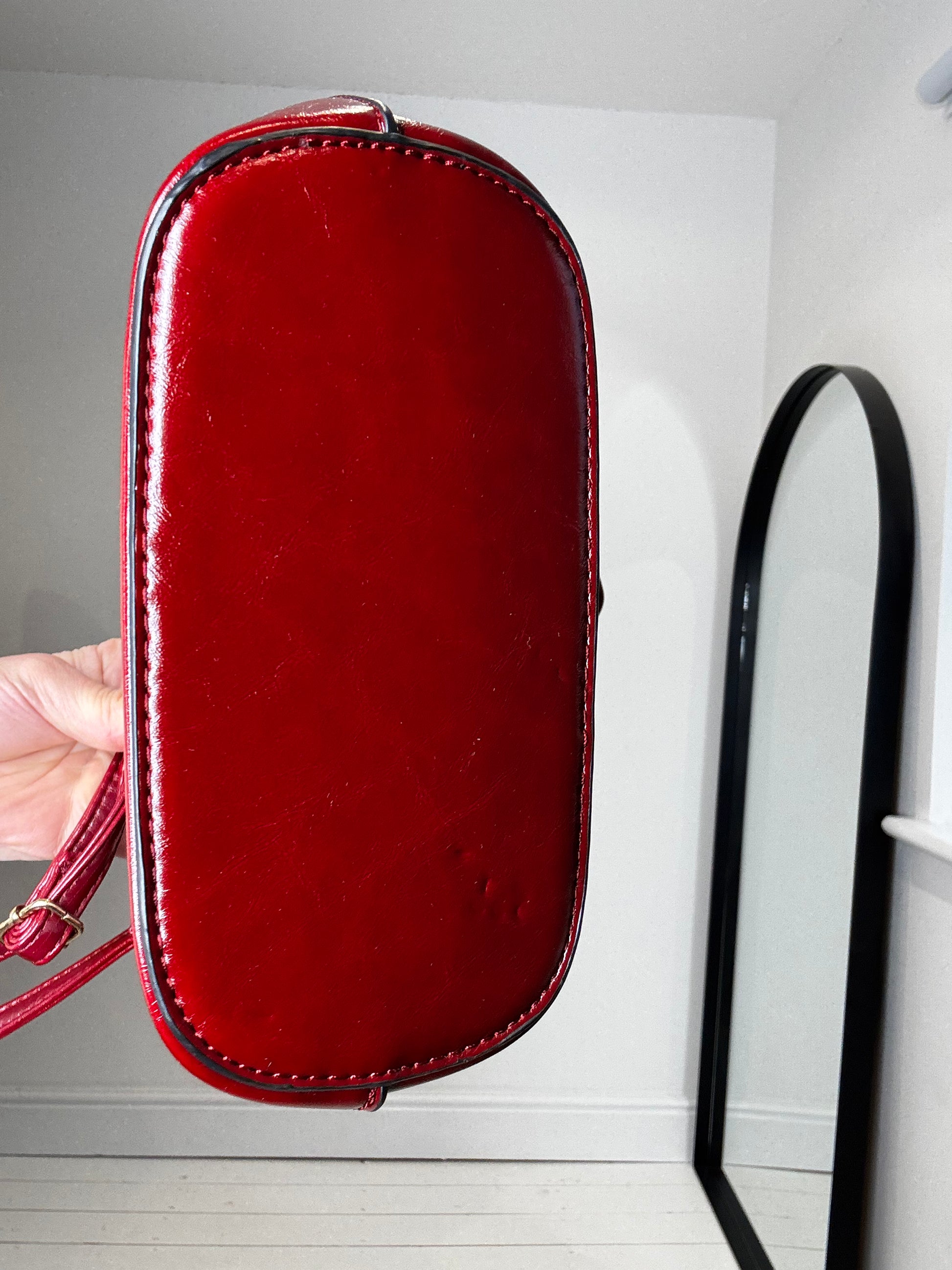 Burgandy shoulder / cross body bucket bag, gold slot lock hardware, adjustable and removable strap so could be used as a handheld clutch style too, solid base, zip pocket on the back, lined inside, one small bit of damage to underside of strap, see last photo, one size