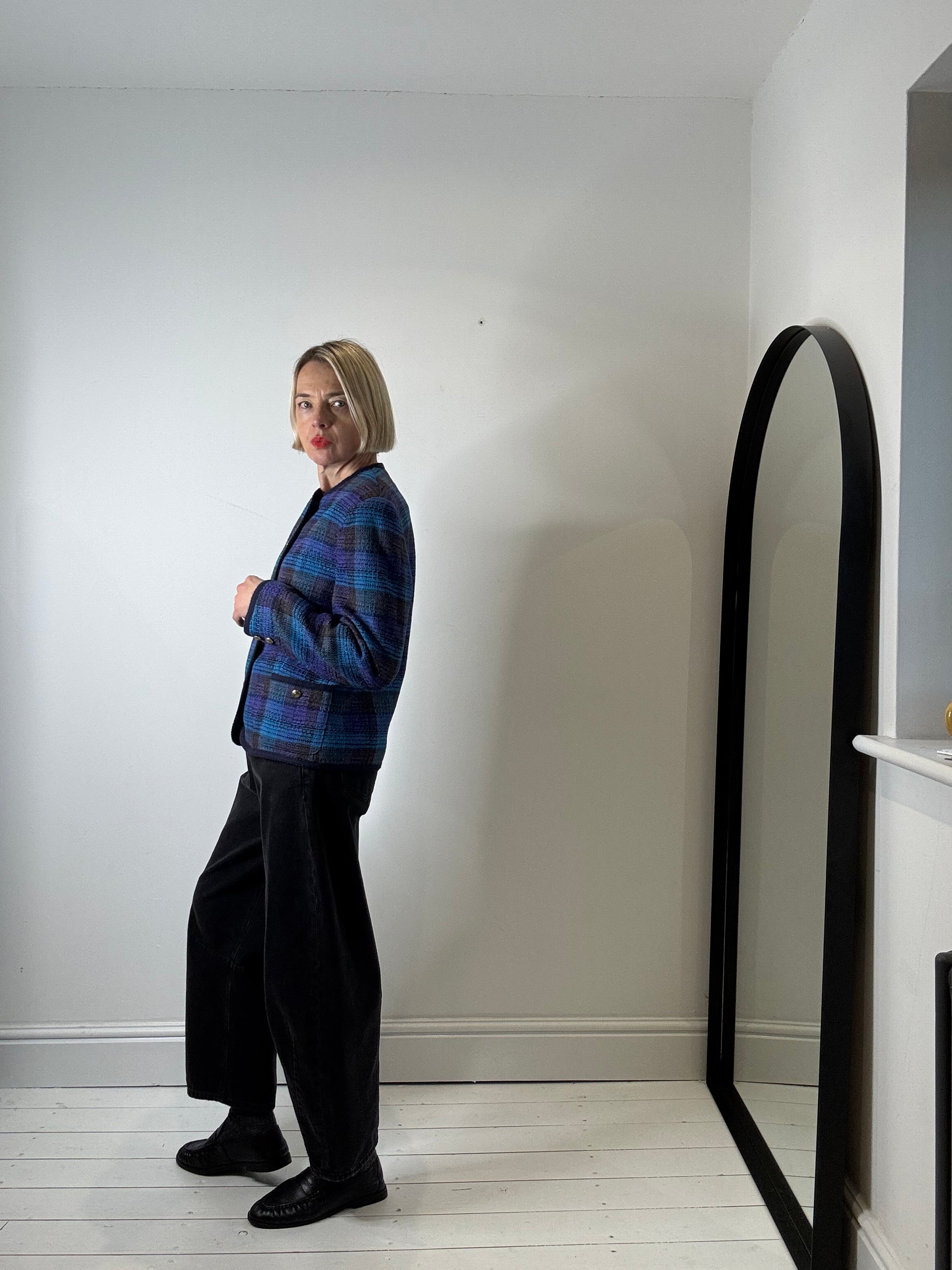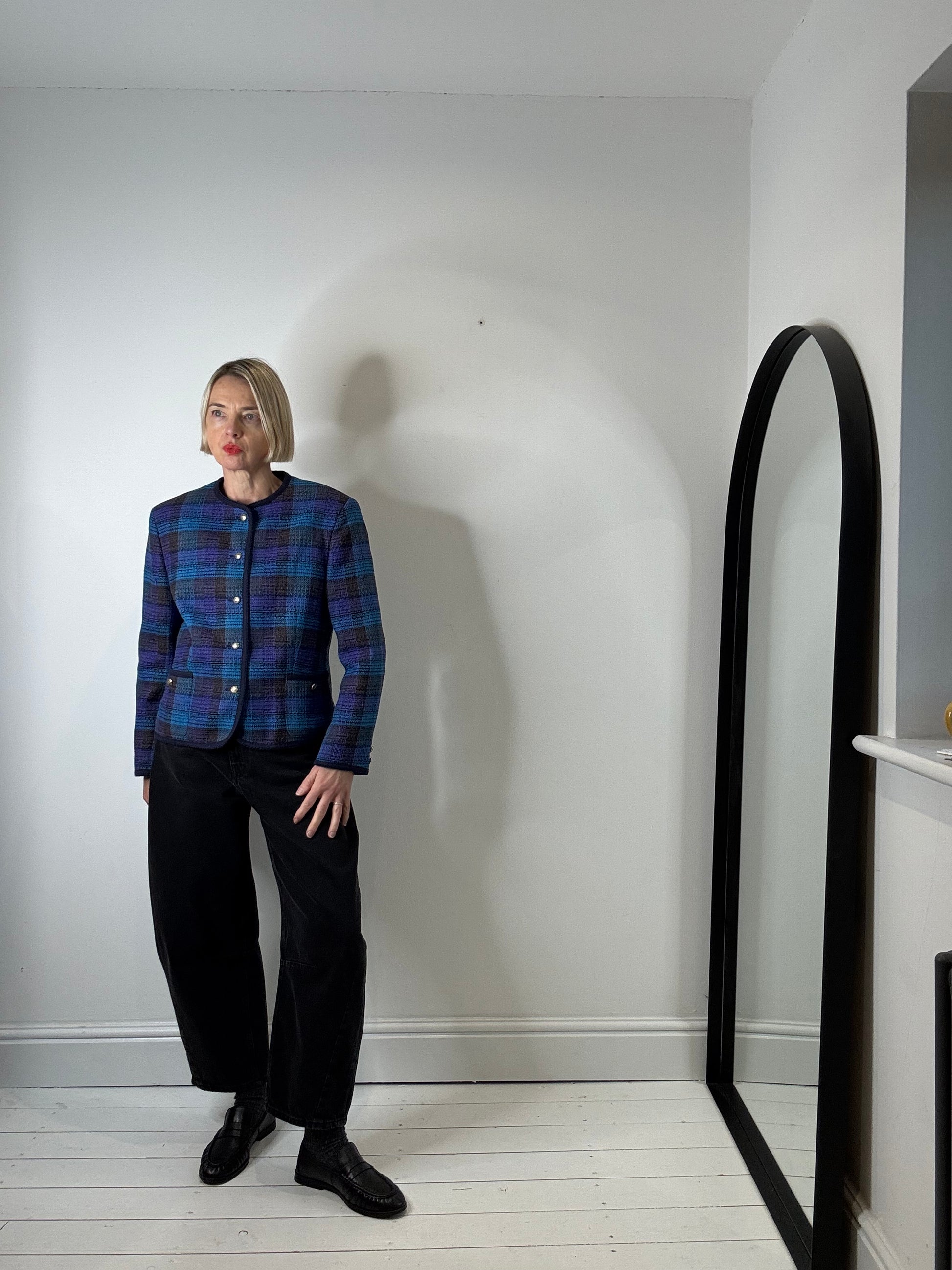 100% Pure New Wool collarless bound edge jacket, gold embossed shank buttons, fully lined, welt pockets with matching buttons, labelled size 12, fit 8-12