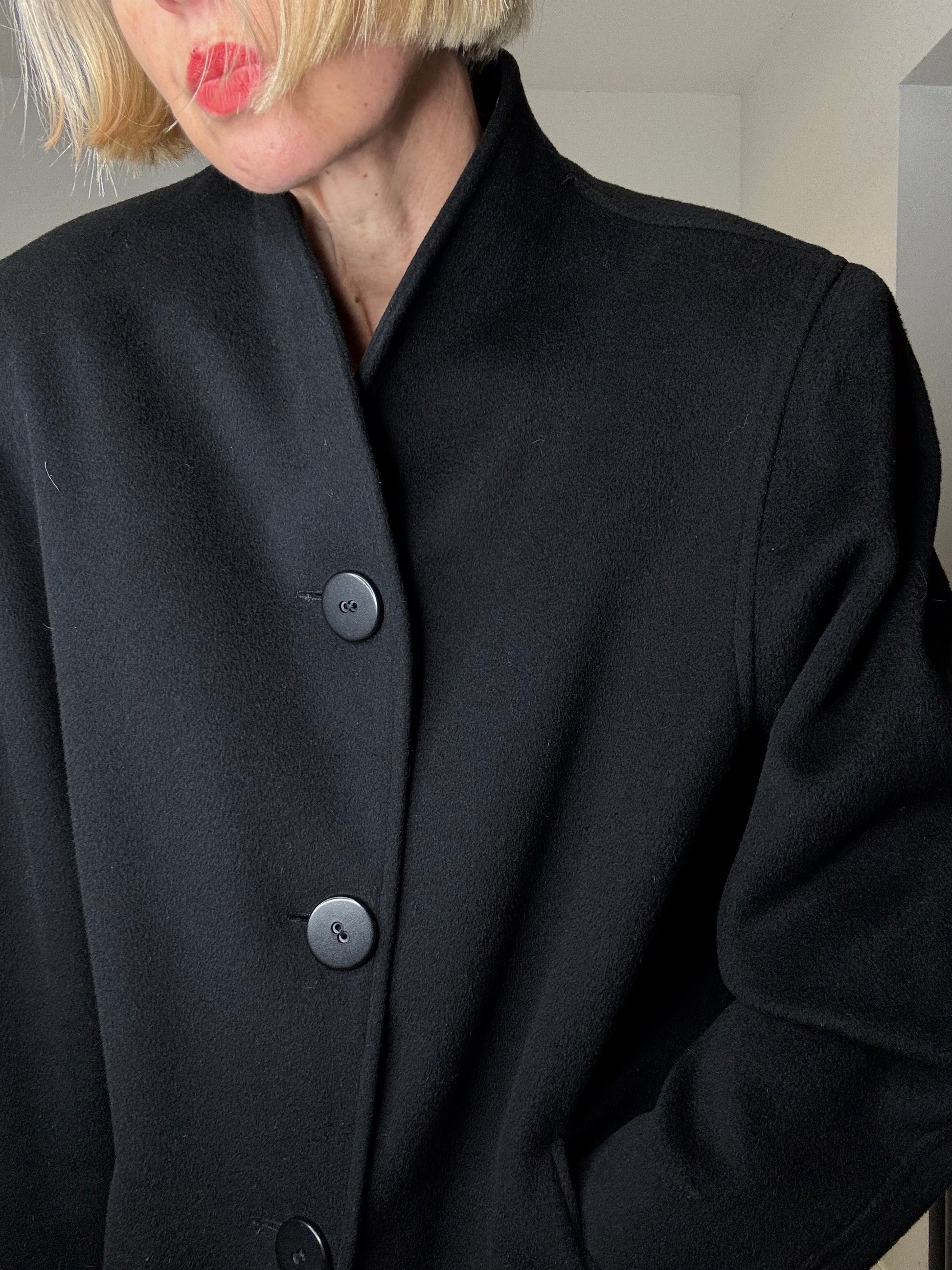 Angora, wool and cashmere single breasted coat, grown on collar, moulder shoulder, jet pockets, stunning shape in excellent condition, armpit circ is 116cm, length is 93.5cm, fully lined, FIT 8 to 10, possibly a 12, depending on the desired overall look