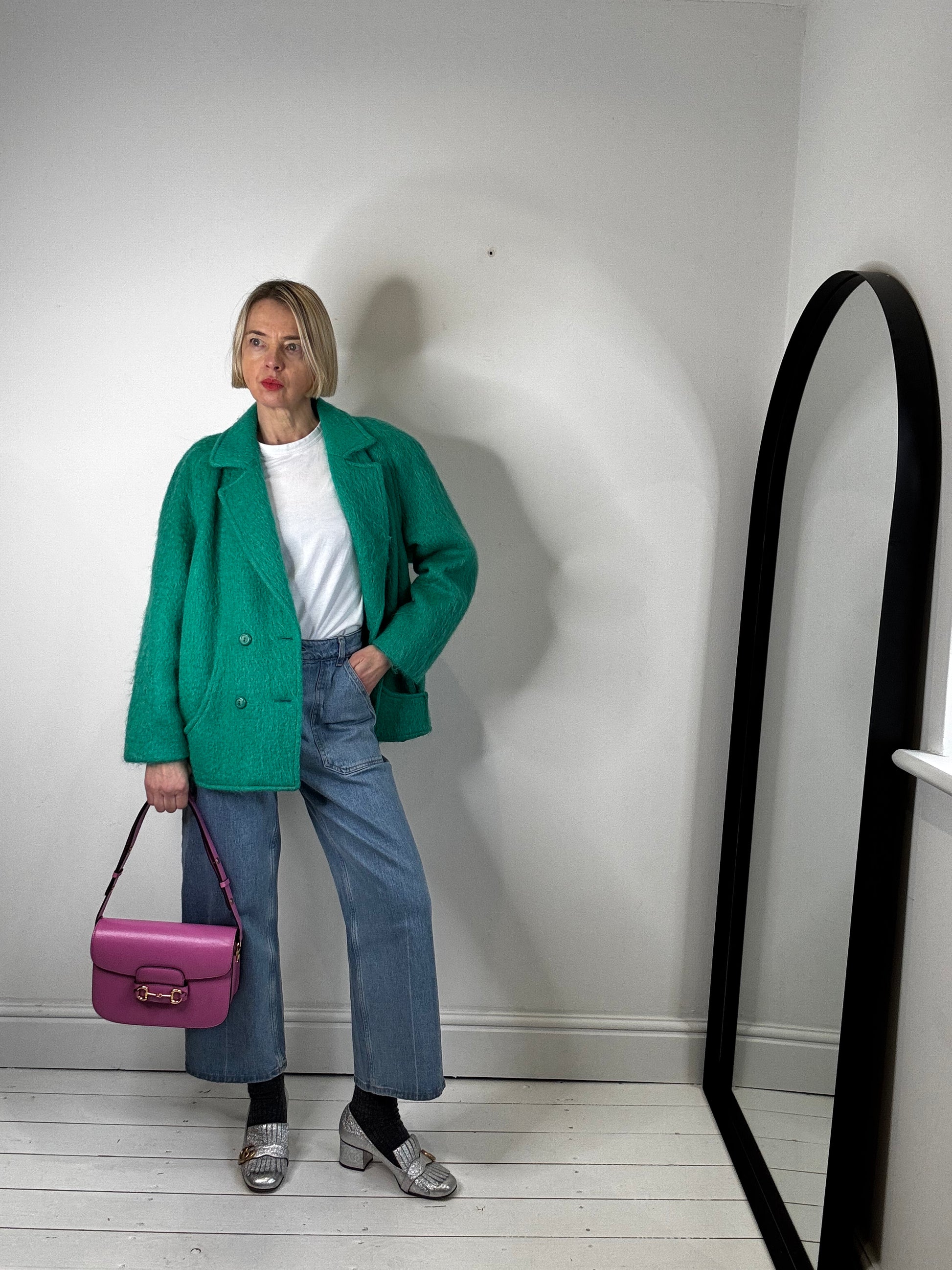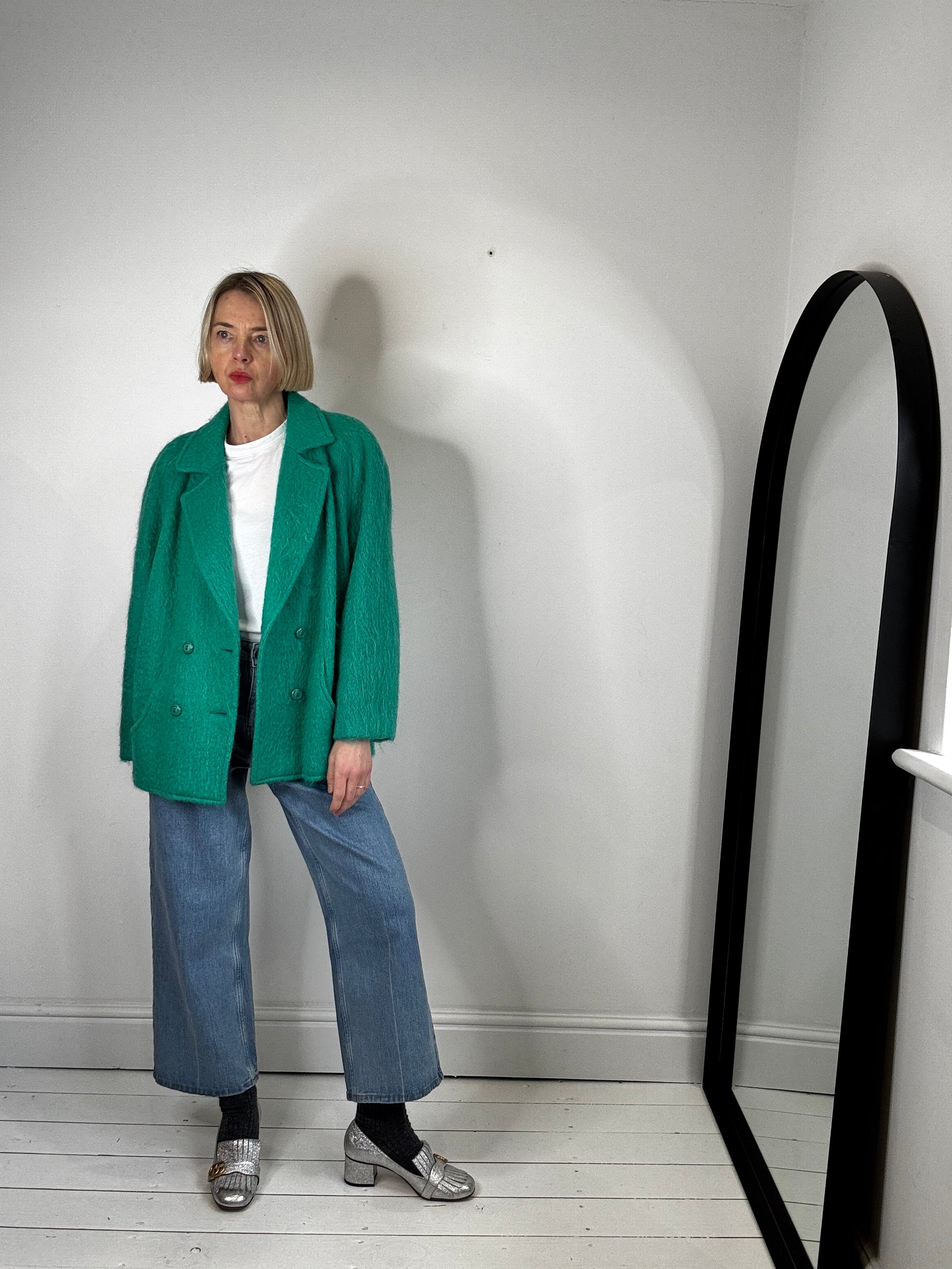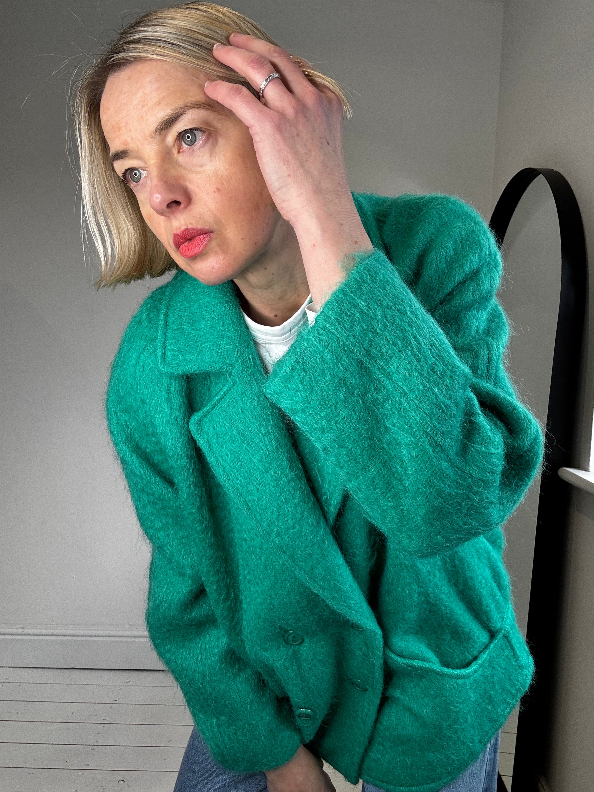 A rare and stunning example of a Murray Brothers wool and mohair short coat, fully lined, db fastening, curved seam details with pockets set into the seams, raglan sleeves, subtle bomber hem style design with back pleat detail, fabulous bold green colour, light and lofty, made in Scotland, armpit circ 126cm, hem circ 112cm, 55% wool, 40% mohair, 5% nylon, depending on desired look FIT 8 to 12