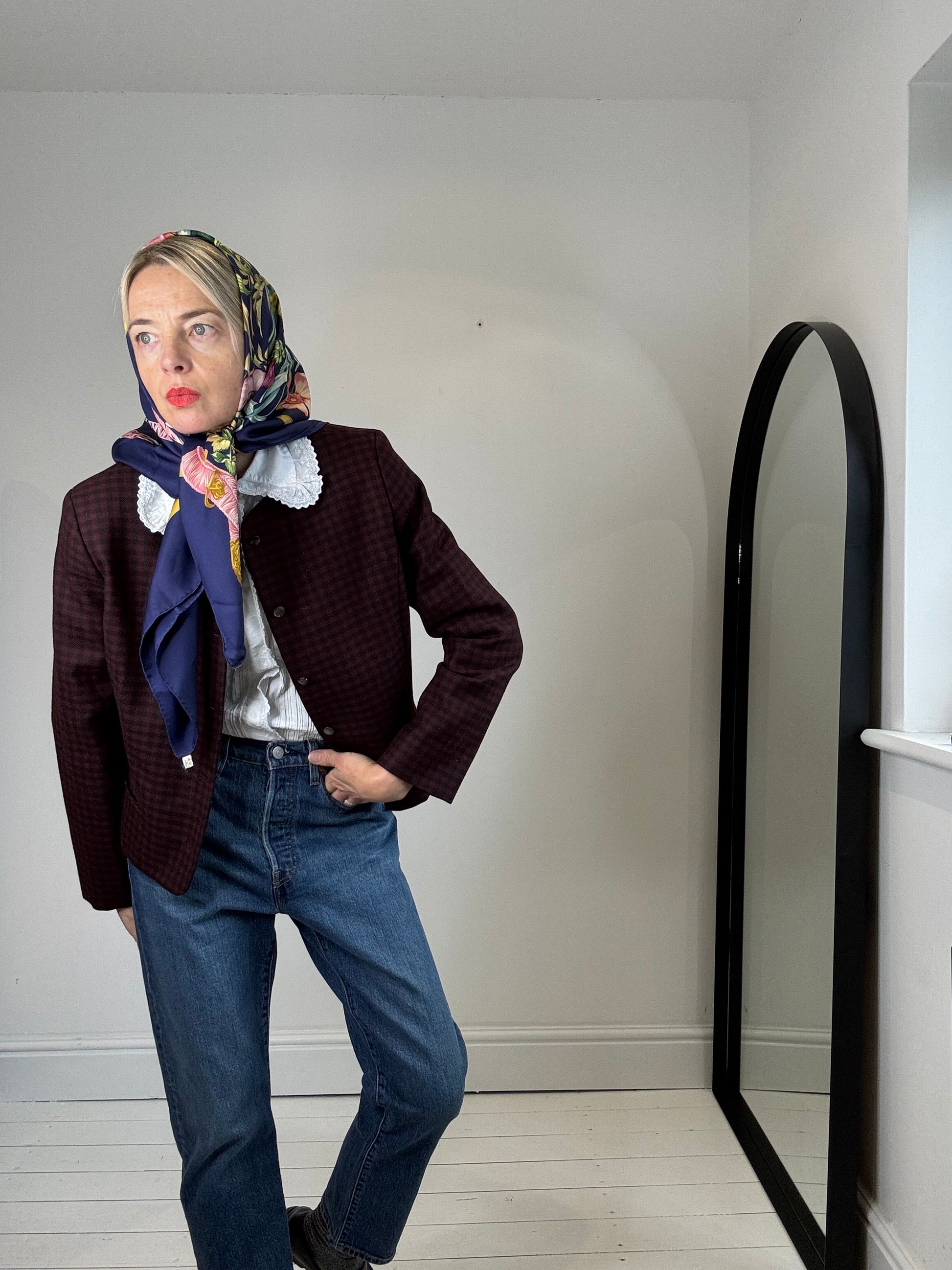 FIT 12 or 14 Wool check sb jacket, fully lined acetate twill, lovely little pearlescent shank buttons, jet pockets, armpit circ 102cm, no labels, very well made, feels like a high end brand like Aquascutum, has matching skirt