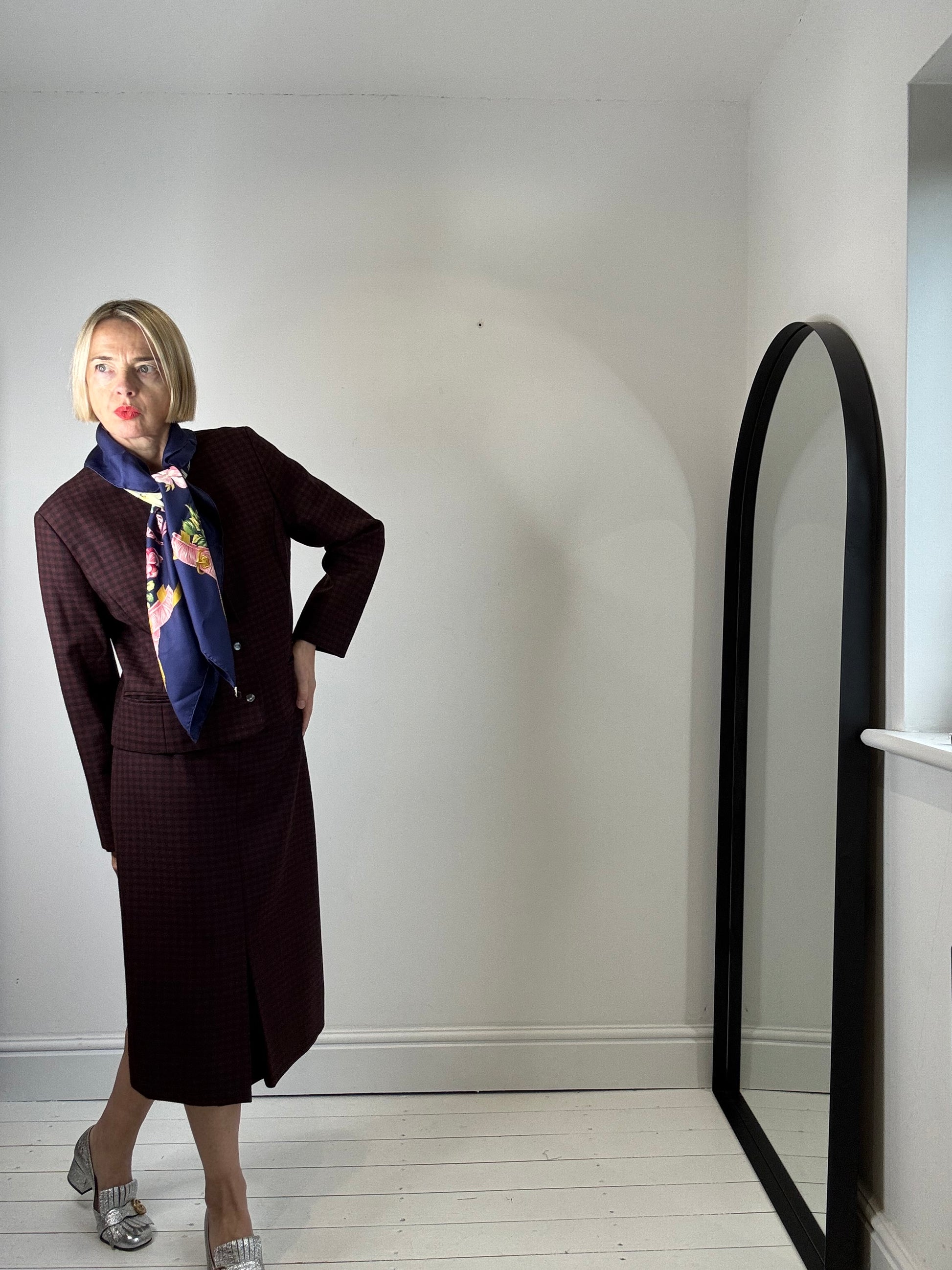 FIT 12 or 14, Wool check burgundy and black, concealed zip with extended tab hook n eye fastening, fully lined, box pleat at the back, waist circ 79cm, length 68cm, matching jacket available
