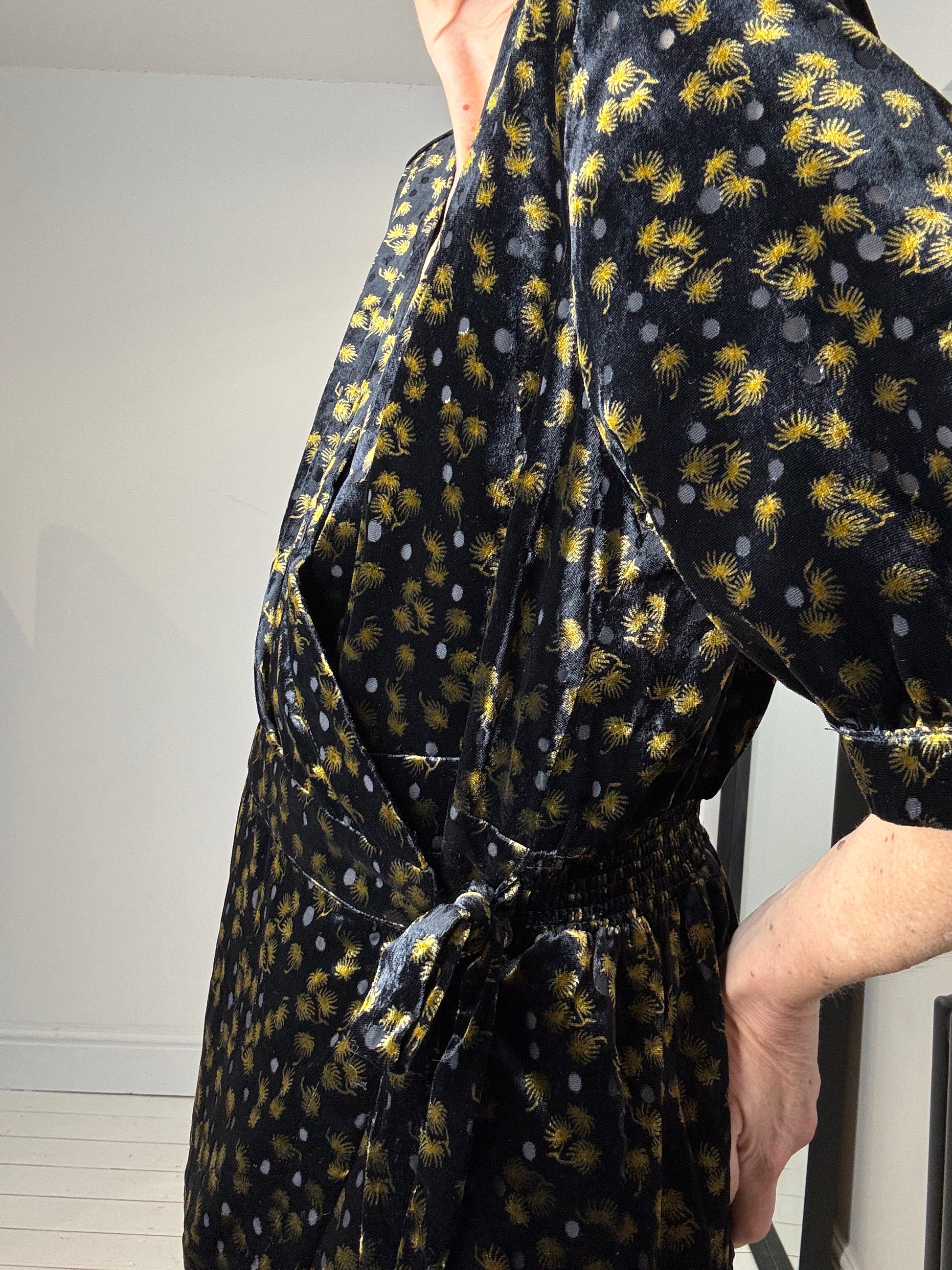 Black velvet top, velvet with tie side, elasticated channel at the back, gold abstract star burst and devoré spot, crepe lined with crepe shoulder piping, RRP £75, labelled size 16